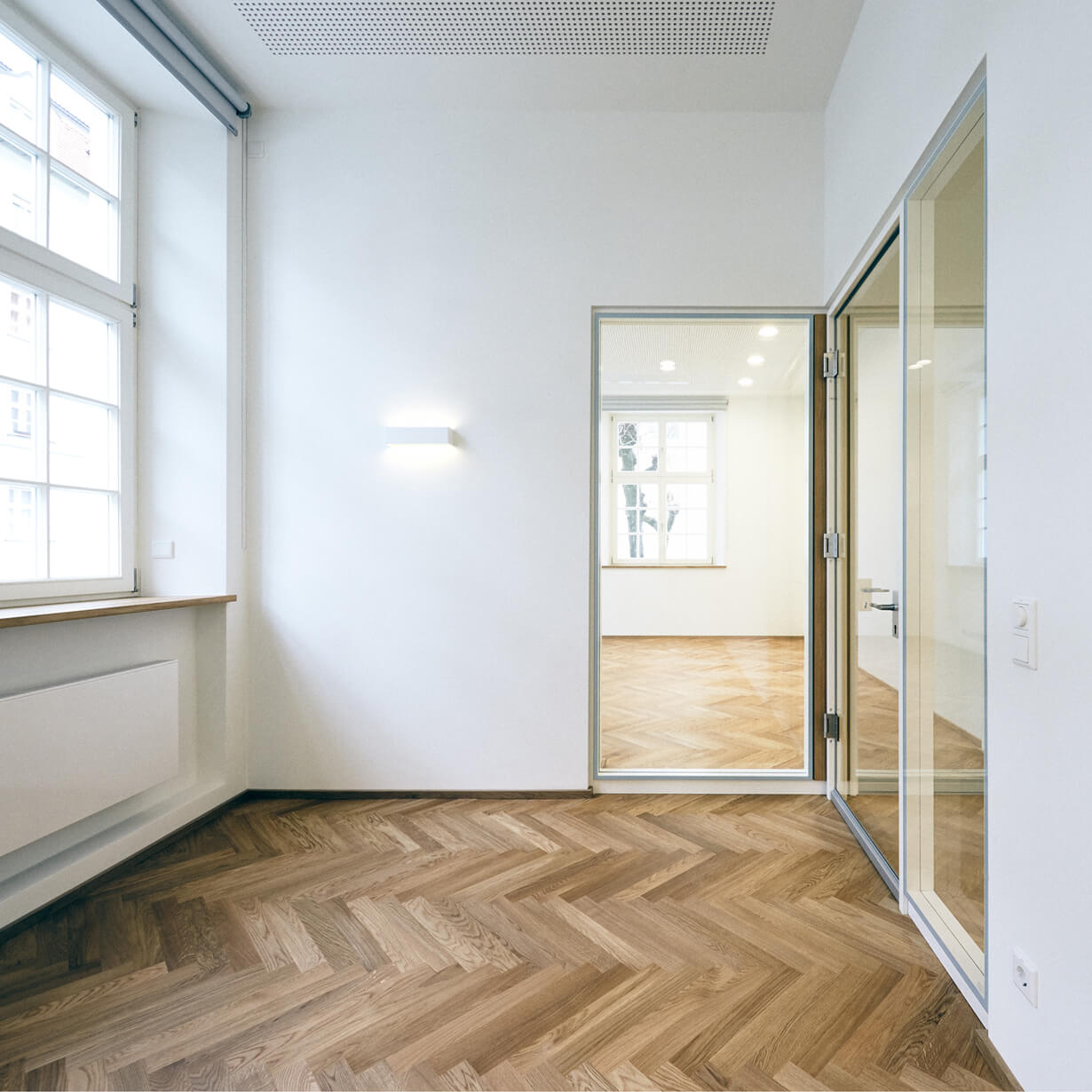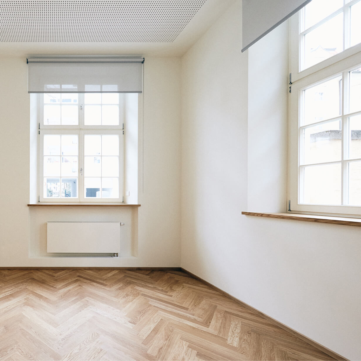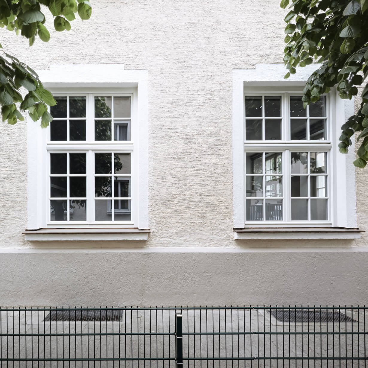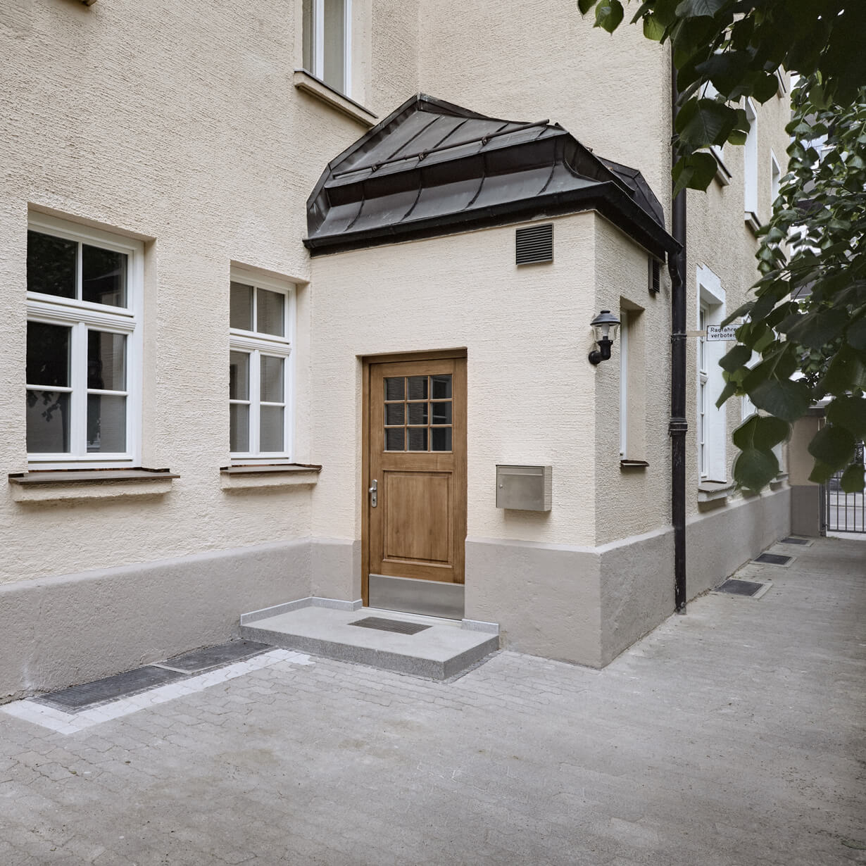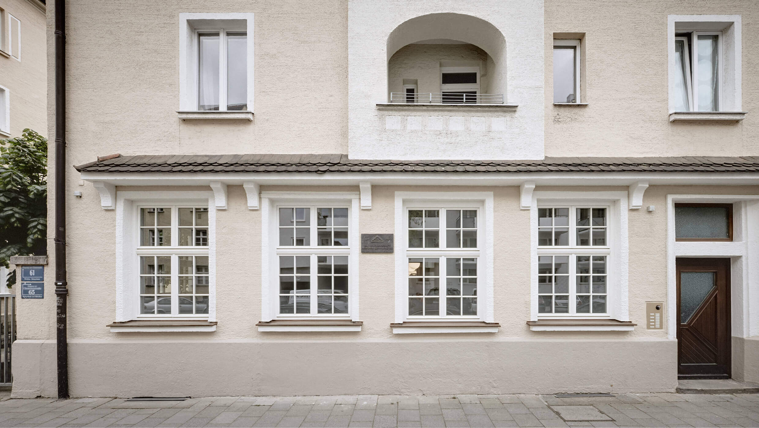 Früher waren die Büroräume eine alte Wirtschaft. Solide eingeraucht und seit Jahrzenten patiniert durch all die Tabakschwaden und die schwitzenden Gäste. Dann beschloss der Eigentümer eine Umnutzung für die eigene Verwaltung und damit einhergehend eine Kernsanierung mit allen Auflagen, die so ein ehrwürdiges Gebäude von 1910 so mit sich bringt. Eingelöst wurden neue Fenster nach Denkmalschutzvorgaben, Brandschutzauflagen für die Kellerdecken und statische Ertüchtigungen, die die Rostschäden an den Stahlträgern kompensierten. Bauen im Bestand bringt Überraschungen: angenehme, wie eine weit spannende Tragstruktur und freistehende Stützen, die das Haus tragen. Aber auch unangenehme, wie Schadstoff belastete Böden, die entsorgt werden müssen. Das Ergebnis der Umnutzung sind völlig neue Raumstrukturen, helle, lichtdurchflutete Büroräume, ausgestattet mit Fischgrätparkett aus Eiche, Haustechnik auf neuem Stand und moderne Glastrennwände, die die Vorstandsräume akustisch diskret trennen, aber doch Transparenz zulassen. Respektiert wurden die abgeschrägten Ecken der Unterzüge, damit die alte Struktur ablesbar bleibt. Und überlebt hat die alte Kellertreppe, die noch die Geschichte erzählt, wie damals die Bierfahrer die Bierfässer in den Keller schleppten. Heute schwitzt hier niemand mehr, auch nicht im Sommer und von außen sieht man dem Gebäude auch die schlimmen 70er Jahre nicht mehr an. Zum Glück gibt es noch Handwerker, die historische Putze beherrschen!