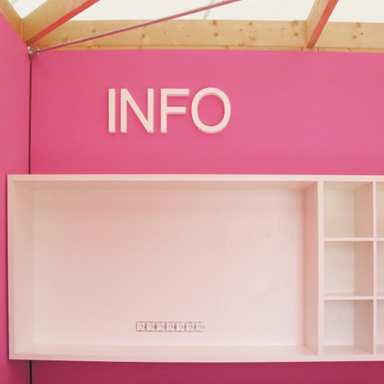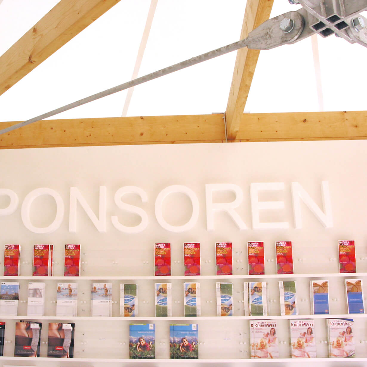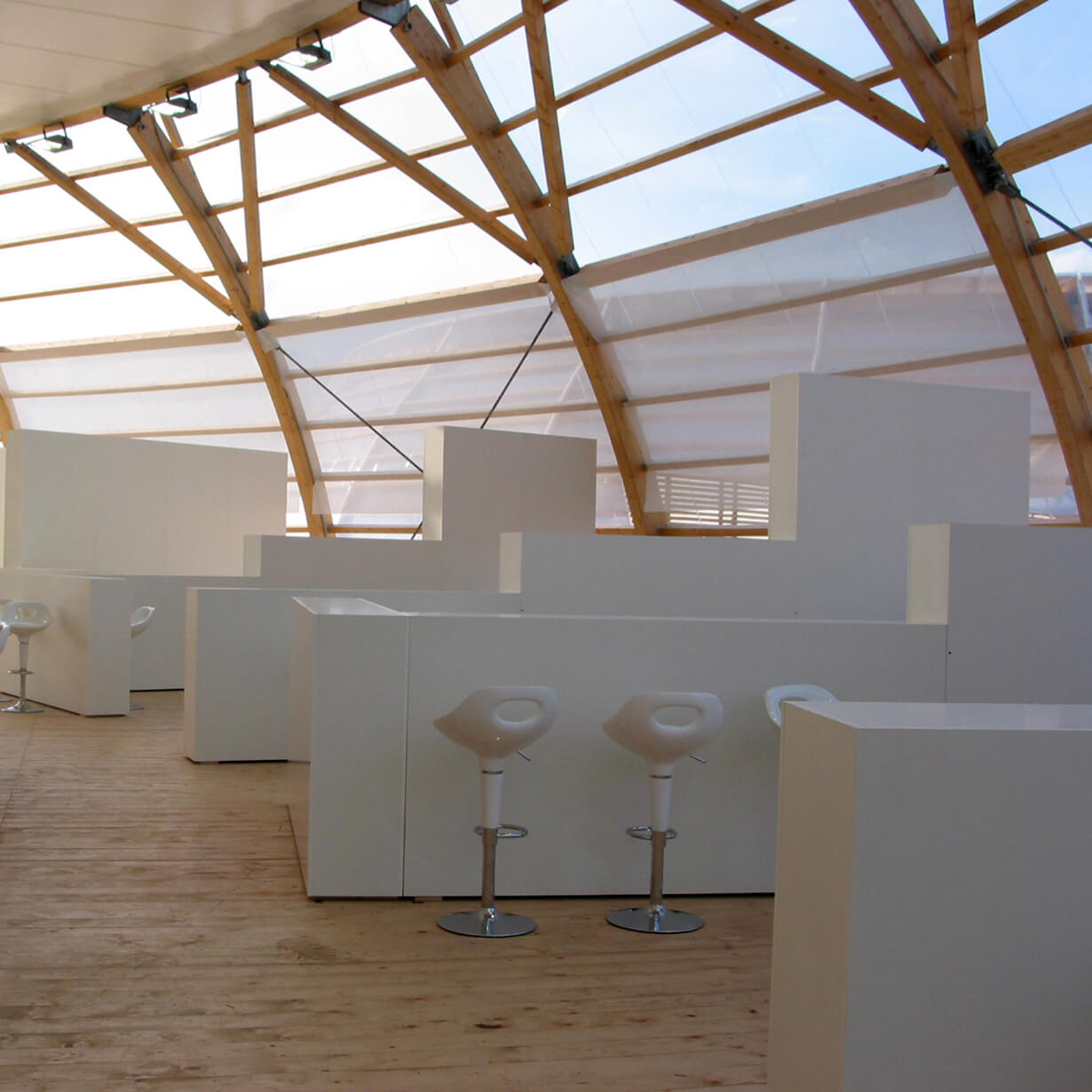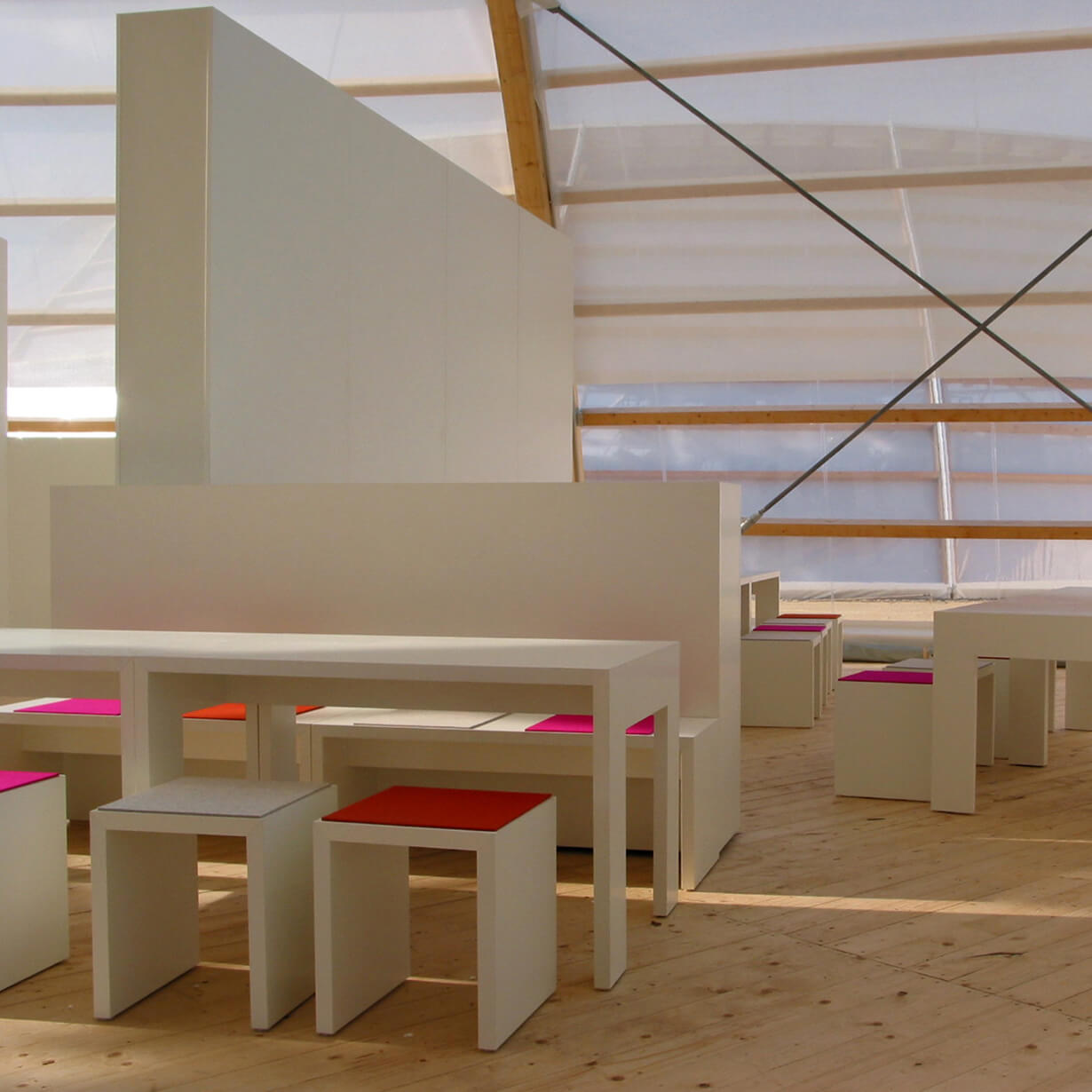 Ein Lustgarten für die Augen und den Gaumen schaffen, das Angenehme mit dem Nützlichen verquicken, das war das Ziel der Ausstellungsgestaltung im Kulturforum. Schlichte, weiße „Galerieräume“ für wechselnde Ausstellungen umrahmen eine Bar, das Mobiliar sitzt ebenfalls einfach dazwischen. Die Bilder und die Menschen drumherum bilden die Farbkleckse dazu. Kräftige Farbkleckse werden auch im Inneren der kleinen Pavillons gesetzt. Die BUGA-Farben samt Schriften werden ins 3-Dimensionale übertragen, machen Stimmung und helfen bei der Orientierung.