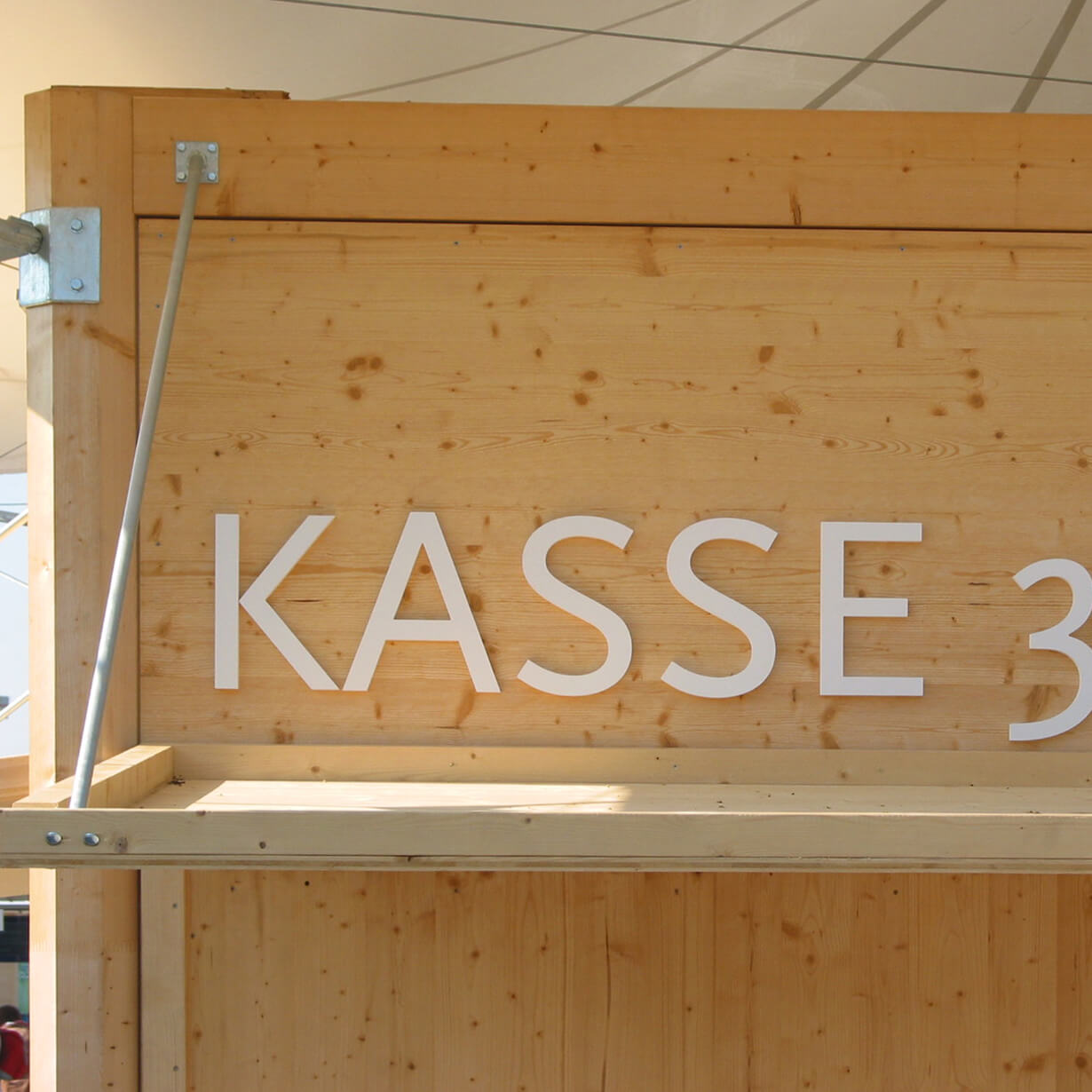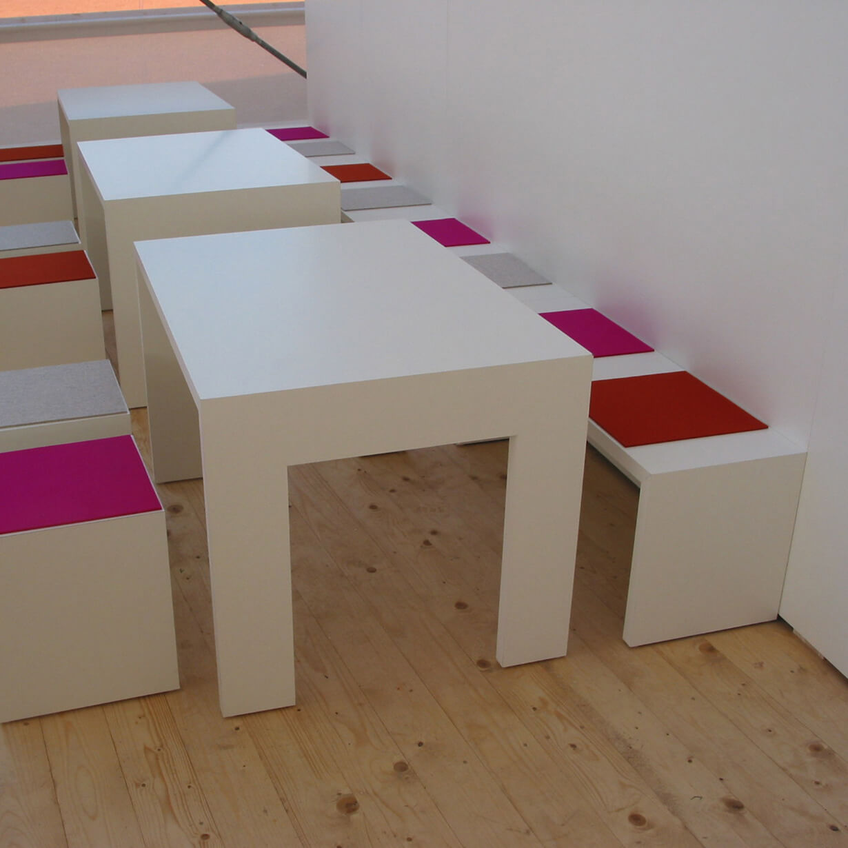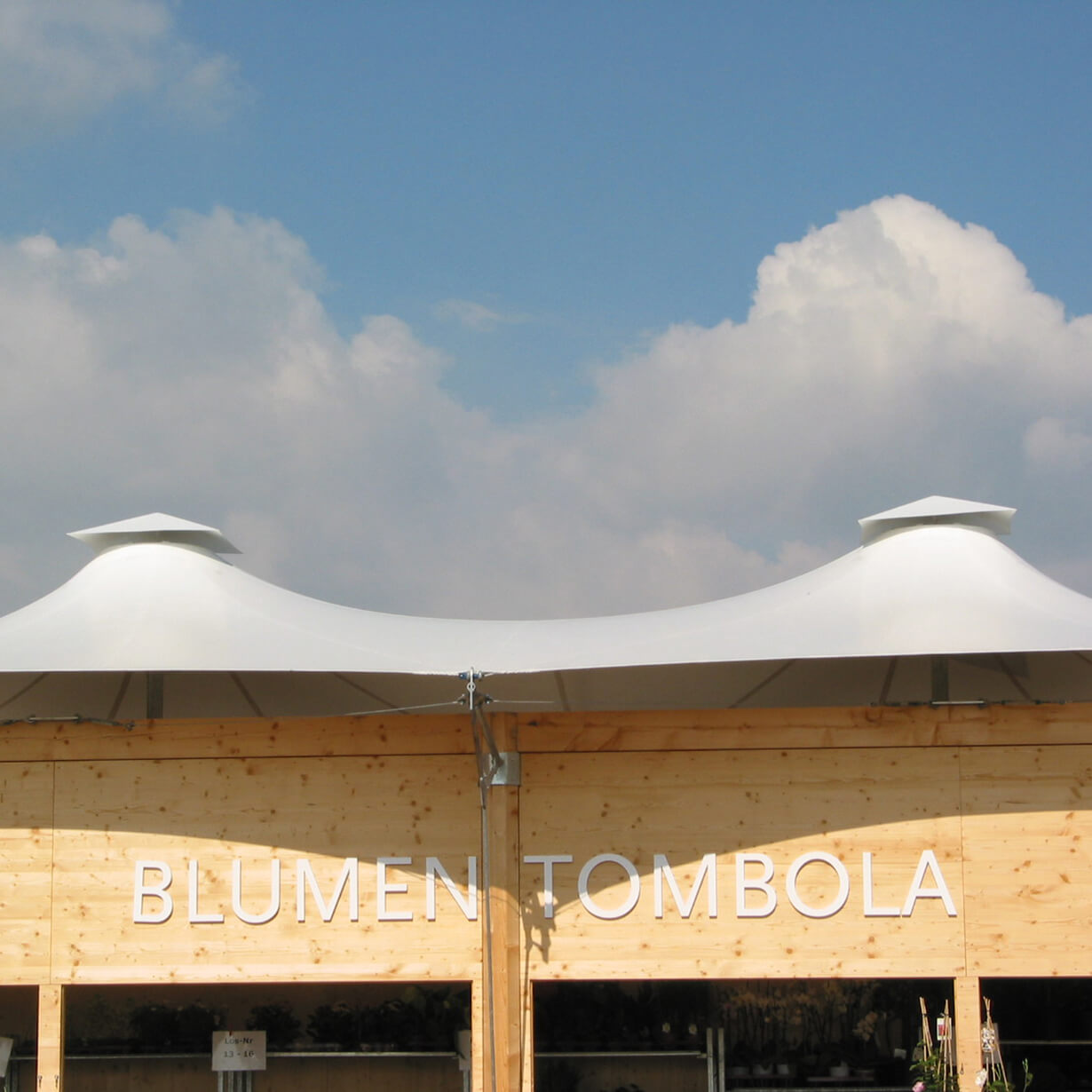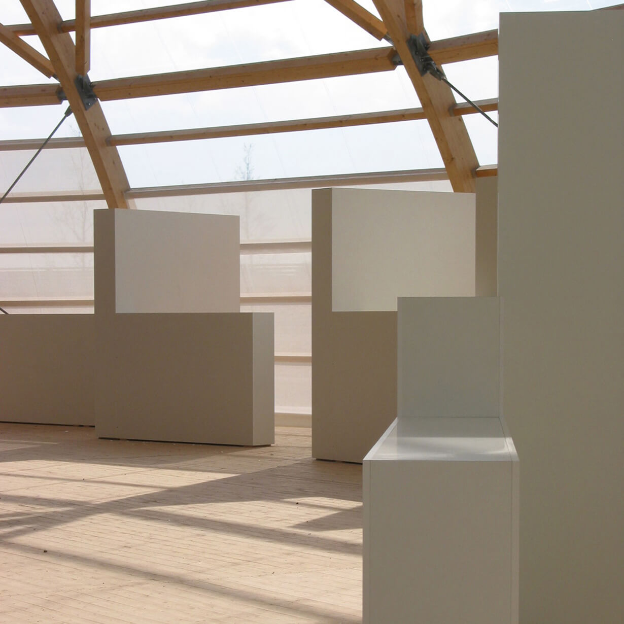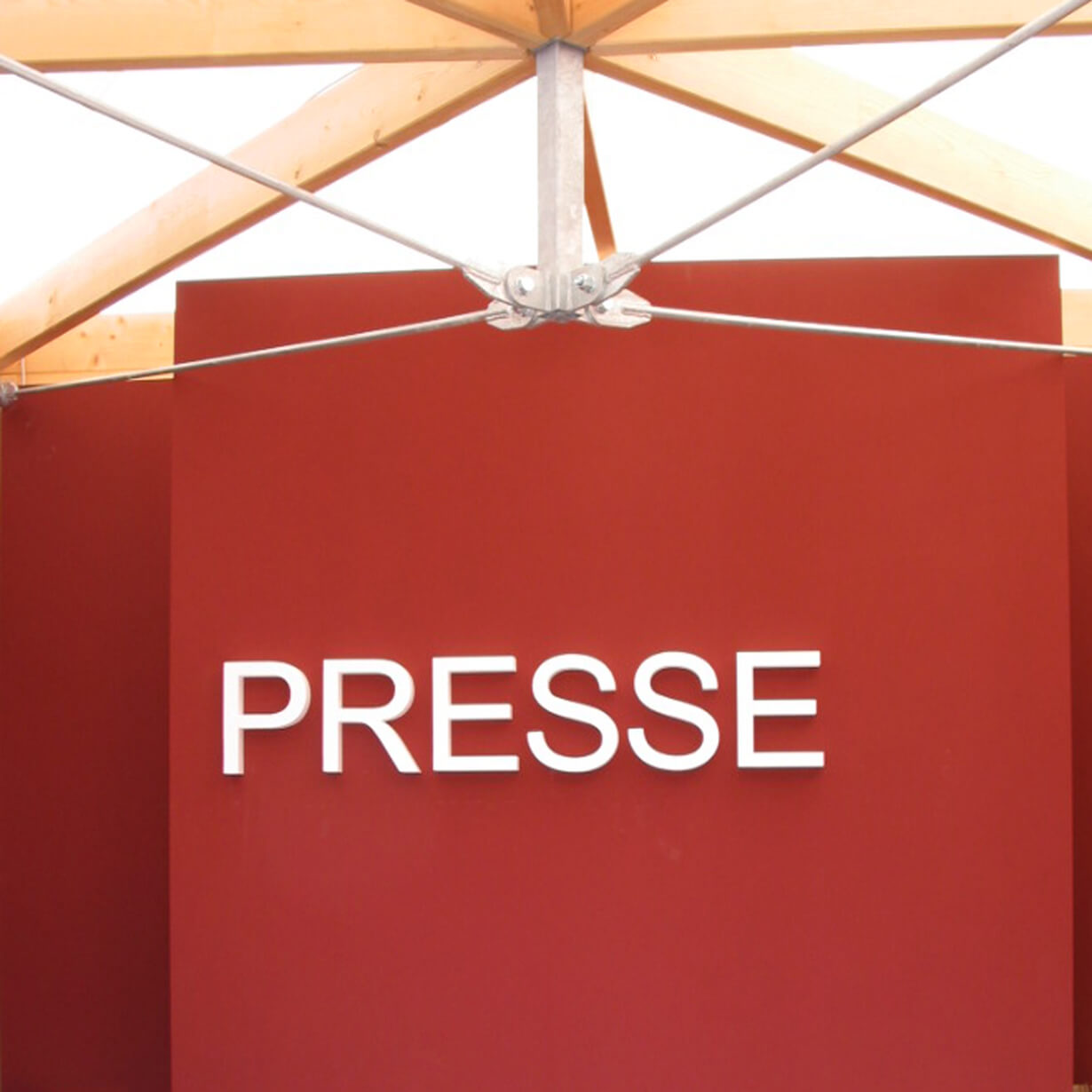 Ein Lustgarten für die Augen und den Gaumen schaffen, das Angenehme mit dem Nützlichen verquicken, das war das Ziel der Ausstellungsgestaltung im Kulturforum. Schlichte, weiße „Galerieräume“ für wechselnde Ausstellungen umrahmen eine Bar, das Mobiliar sitzt ebenfalls einfach dazwischen. Die Bilder und die Menschen drumherum bilden die Farbkleckse dazu. Kräftige Farbkleckse werden auch im Inneren der kleinen Pavillons gesetzt. Die BUGA-Farben samt Schriften werden ins 3-Dimensionale übertragen, machen Stimmung und helfen bei der Orientierung.