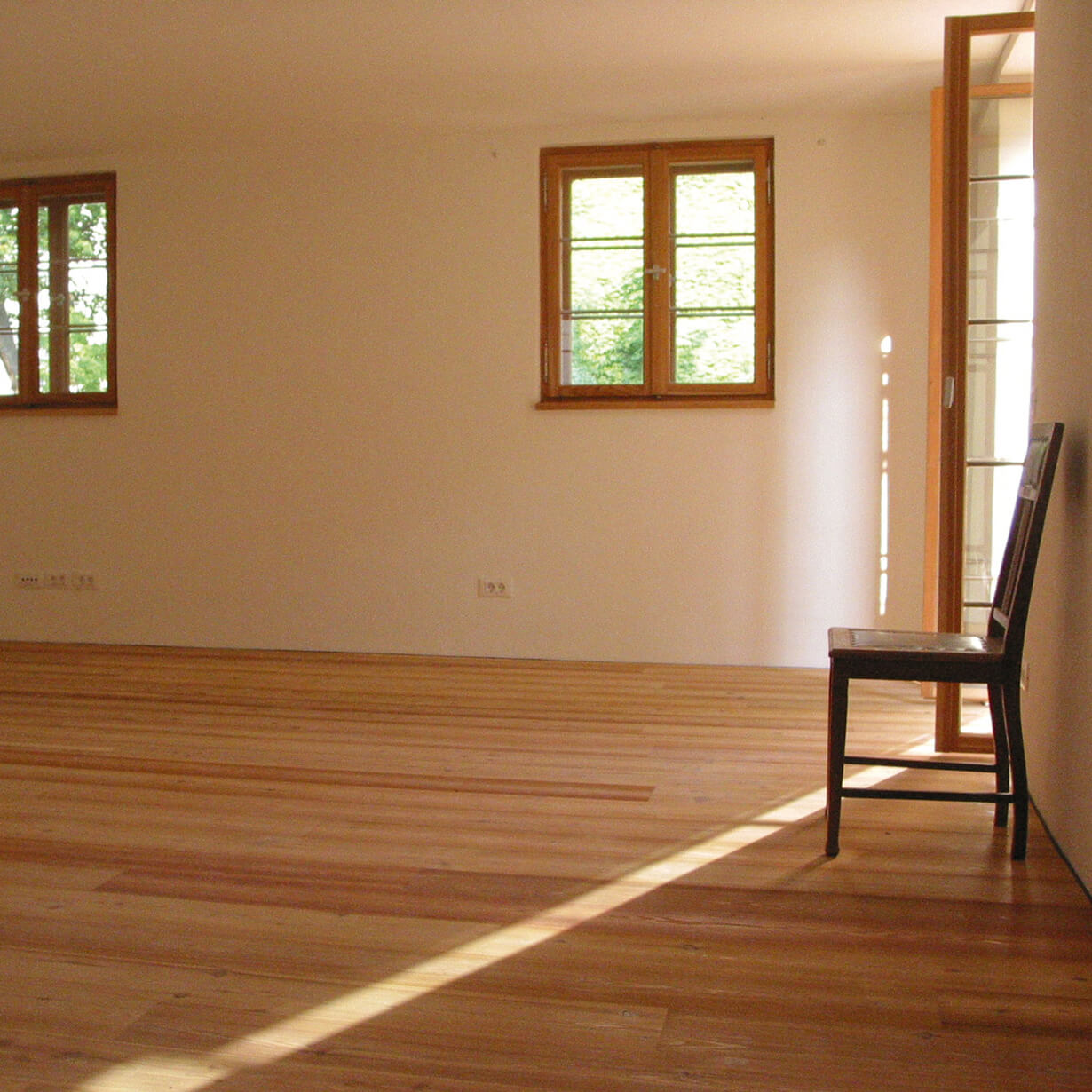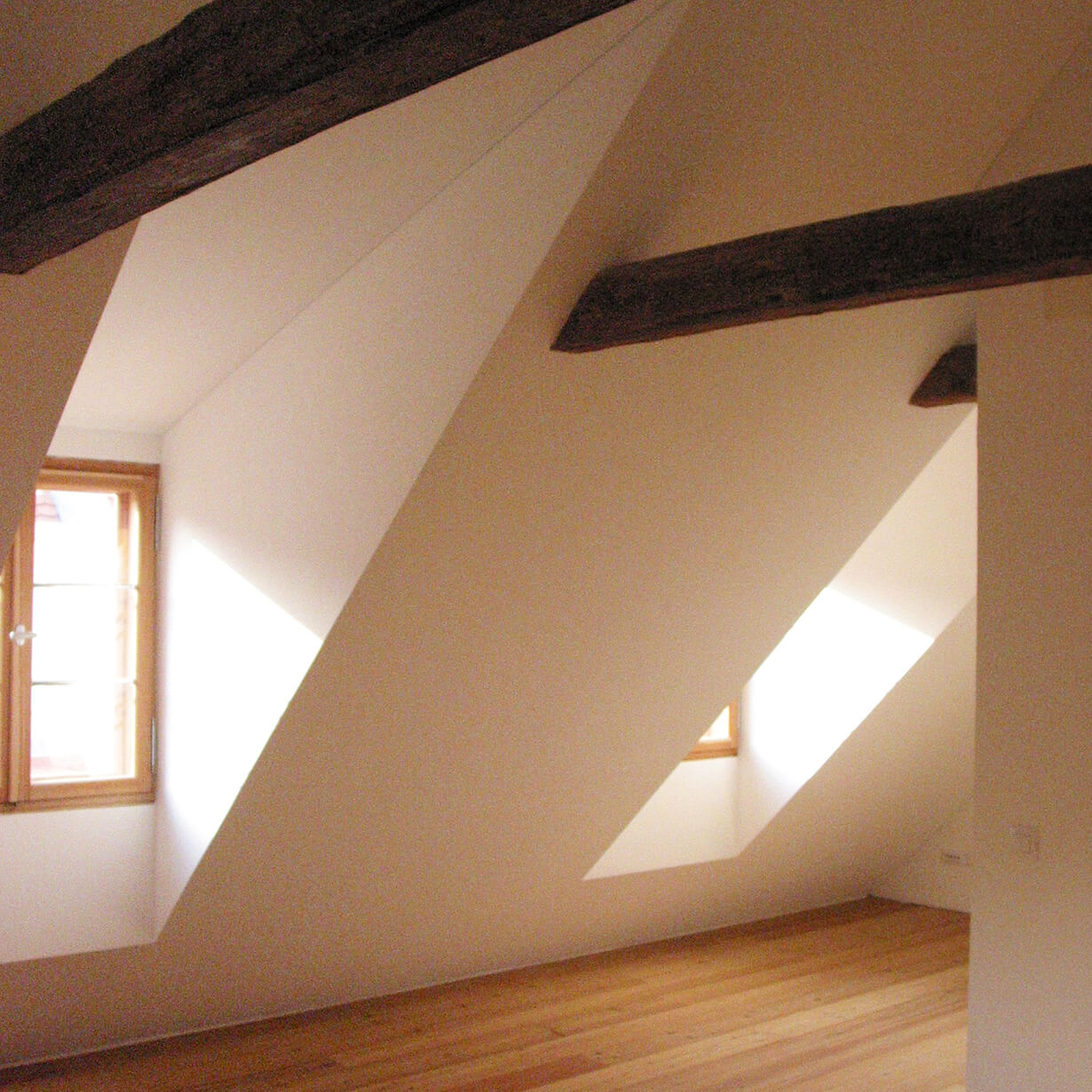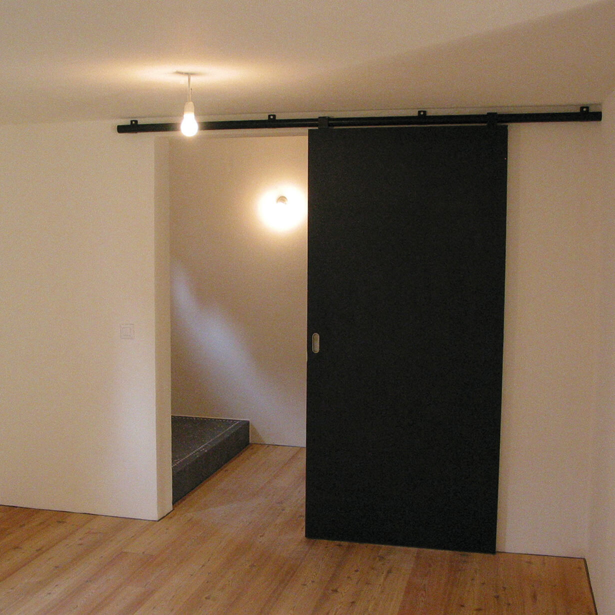 Der unscheinbare Anbau des Gebäudeensembles nennt sich K 20 und steht unter Einzeldenkmalschutz, da er um 1800 im Münchener Haidhausen als eines der ältesten Herbergshäuser erbaut wurde. Vergrößern konnte man nur nach unten, verbessern, sprich totalsanieren mußte man alles. Ein behutsamer Umgang mit der historisch wertvollen Bausubstanz und den gestalterischen Maßnahmen war Priorität. Das Material für Fenster, Türen, Böden und Treppen ist einheitlich Lärchenholz. Schwarz und weiß geben den Innenräumen Ruhe. Klare und schlichte Details funktionieren in ihrer Einfachheit.
