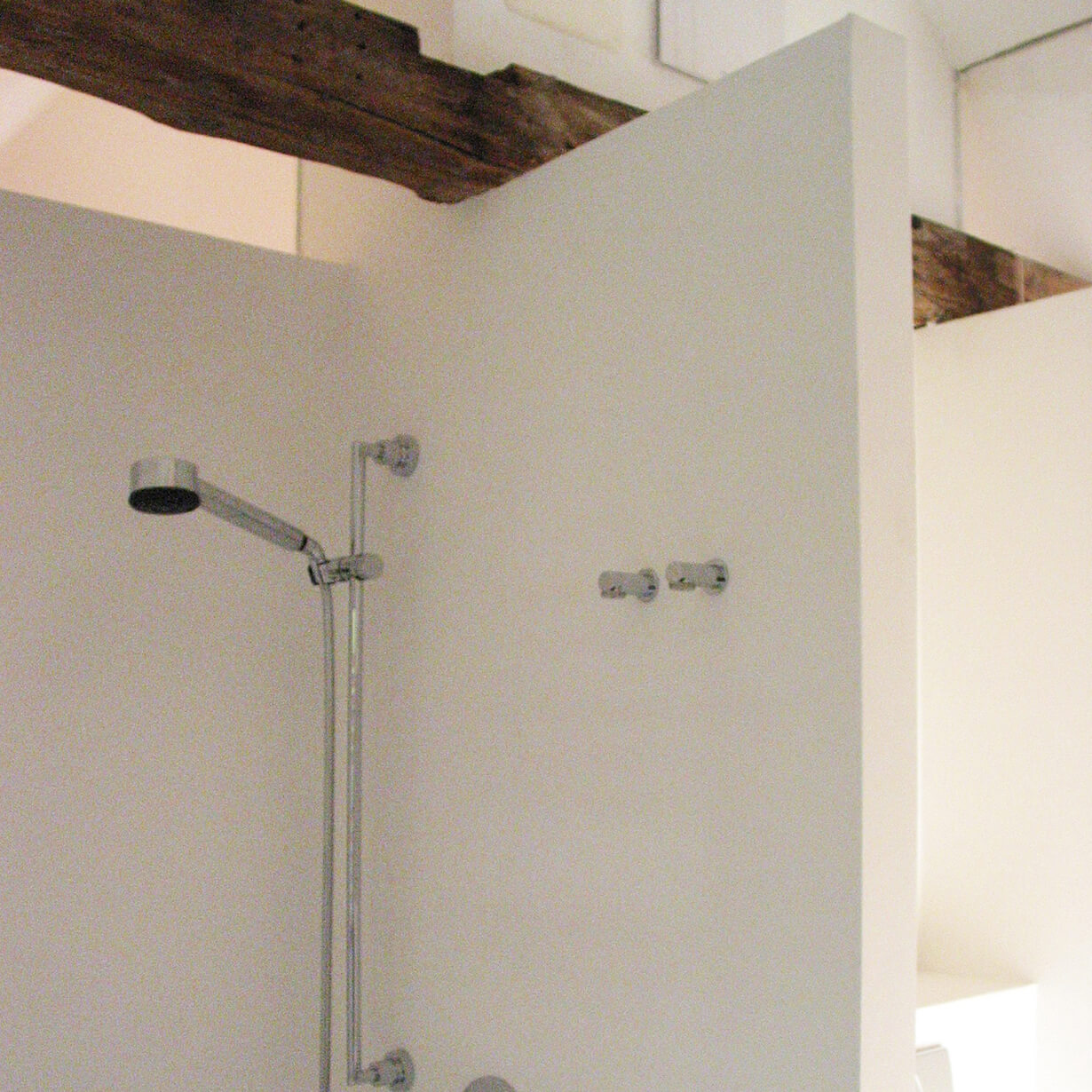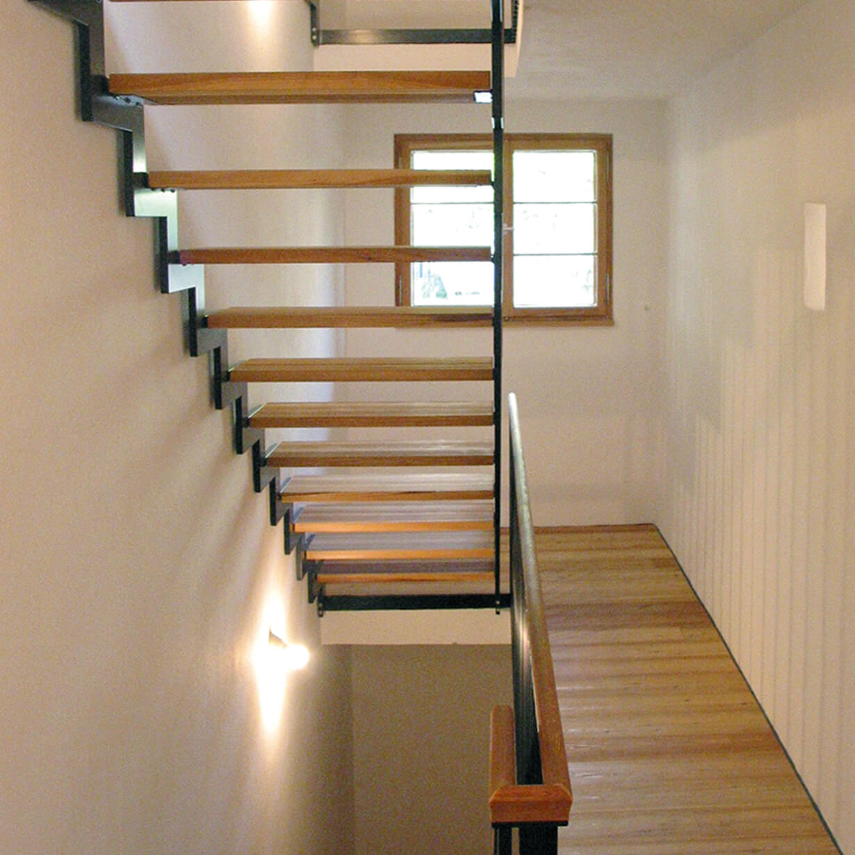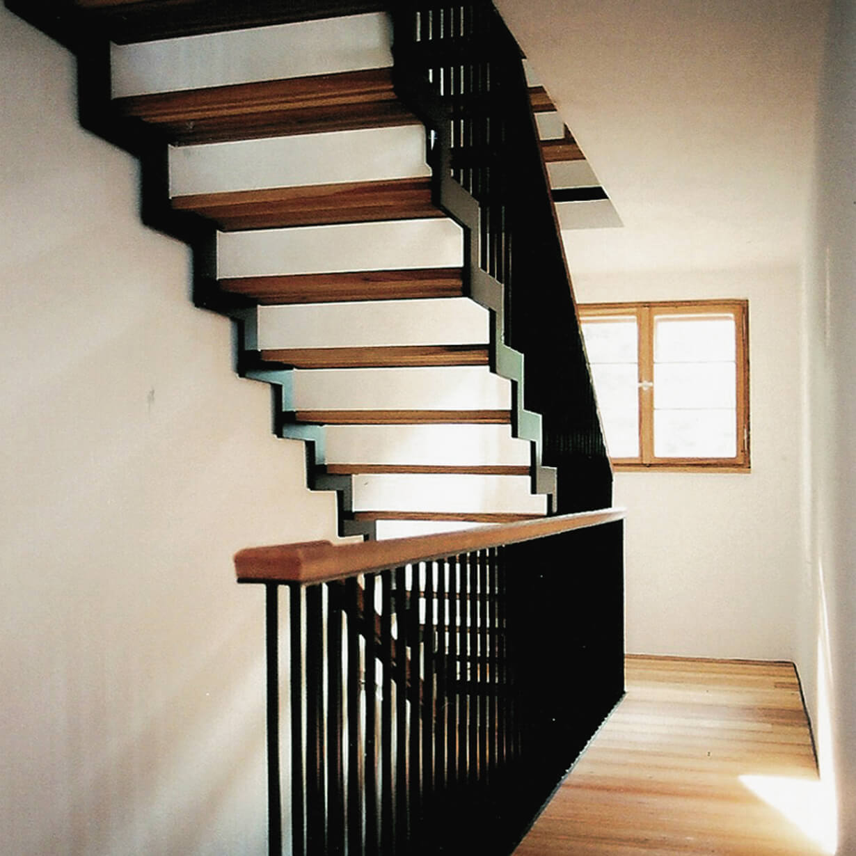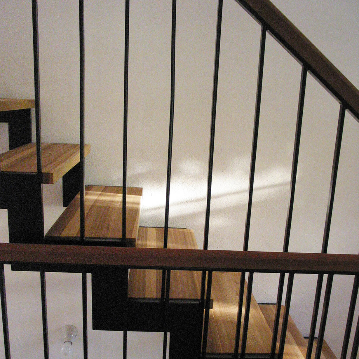 Der unscheinbare Anbau des Gebäudeensembles nennt sich K 20 und steht unter Einzeldenkmalschutz, da er um 1800 im Münchener Haidhausen als eines der ältesten Herbergshäuser erbaut wurde. Vergrößern konnte man nur nach unten, verbessern, sprich totalsanieren mußte man alles. Ein behutsamer Umgang mit der historisch wertvollen Bausubstanz und den gestalterischen Maßnahmen war Priorität. Das Material für Fenster, Türen, Böden und Treppen ist einheitlich Lärchenholz. Schwarz und weiß geben den Innenräumen Ruhe. Klare und schlichte Details funktionieren in ihrer Einfachheit.