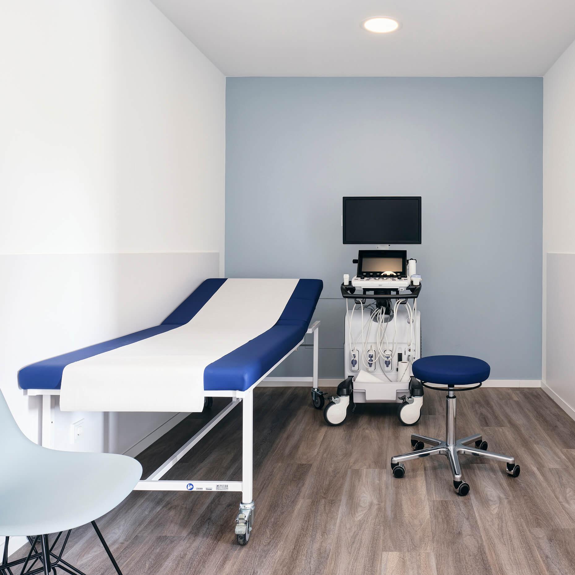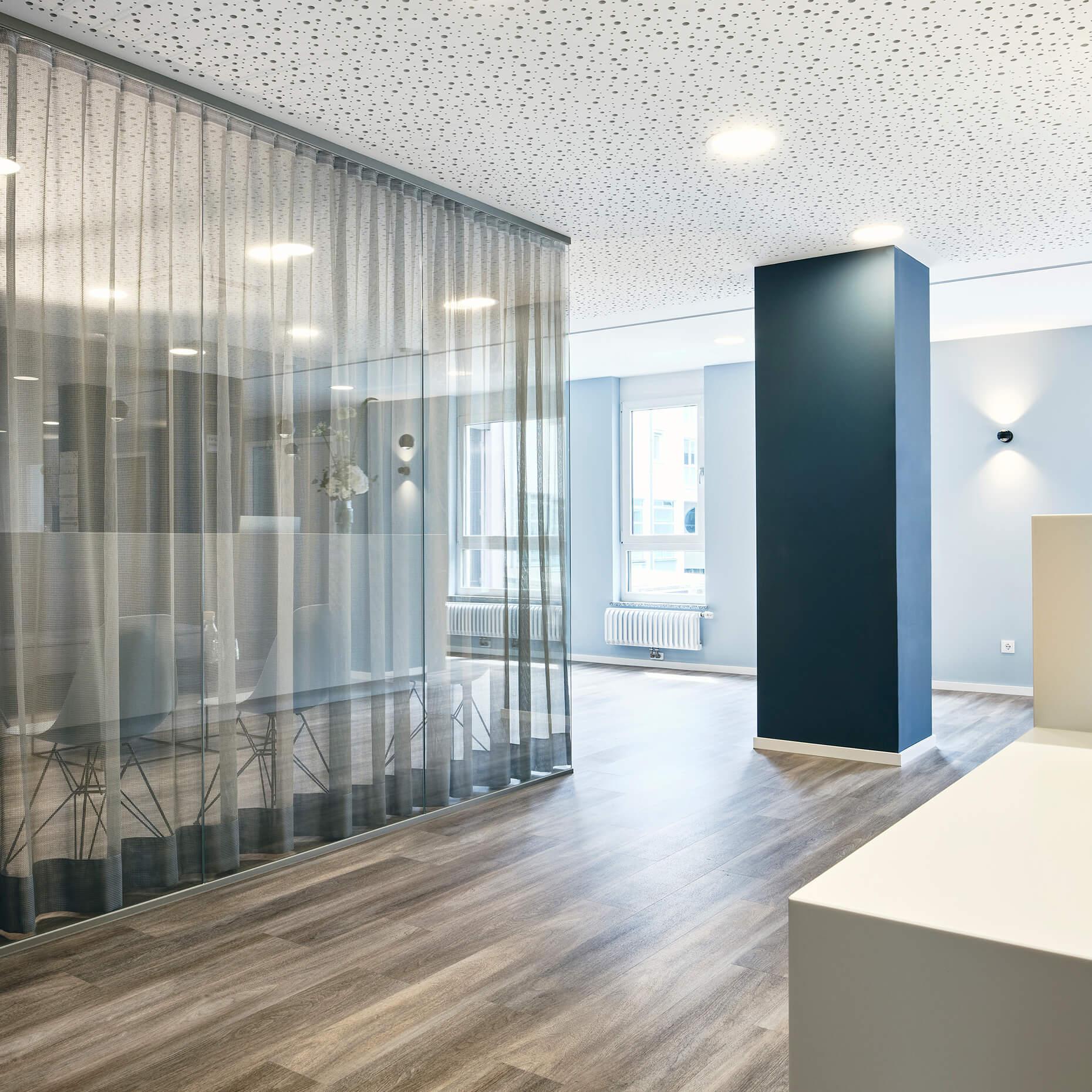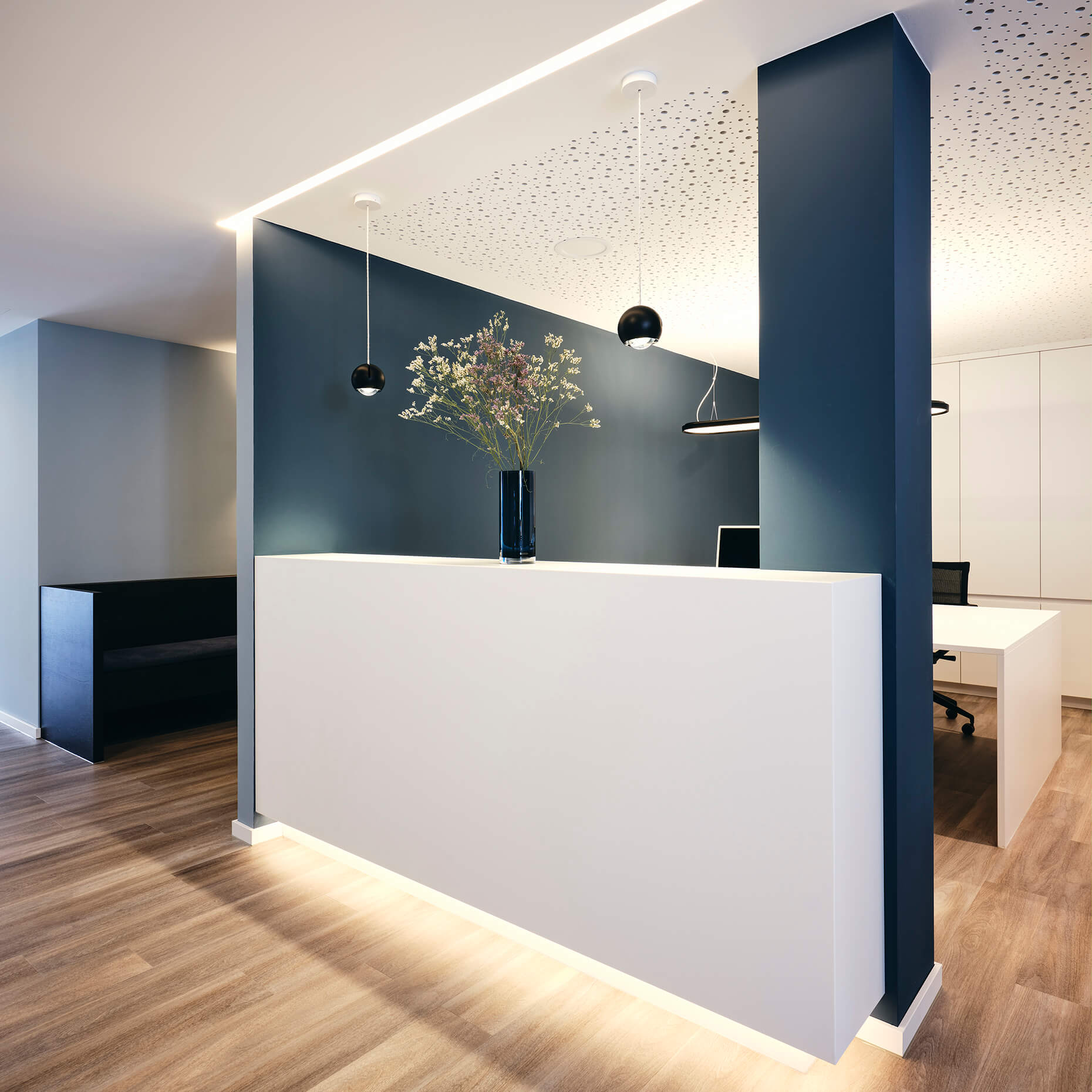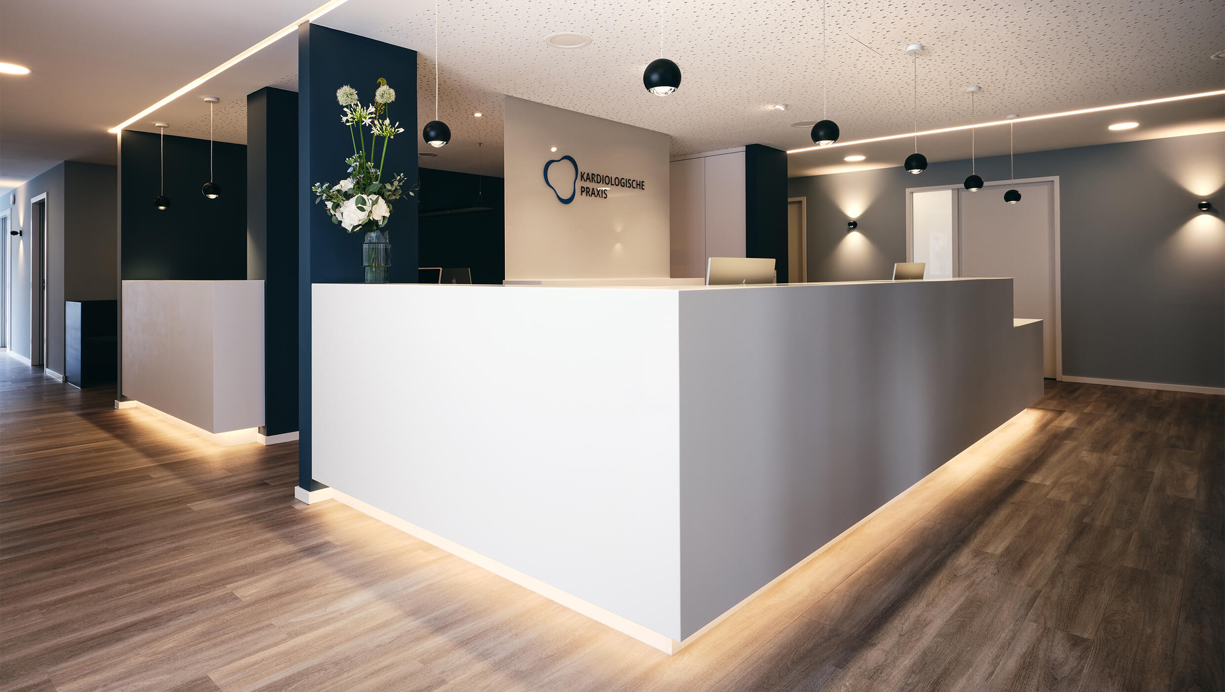 In enger Abstimmung mit dem Ärzteteam wurde zusammen mit Prof. Stefan Bannert eine kardiologische Praxis gestaltet. Die Planung berücksichtigt ergonomische Aspekte, optimiert den Workflow und fördert die Patientenbindung durch eine ansprechende Praxisästhetik.Durch sorgfältig ausgewählte Farben, eine angenehme Akustik und innovative Lichtkonzepte  entsteht eine Umgebung, die Stress reduziert und die Genesung fördert.  Die Wände sind in drei verschiedenen Blauschattierungen gehalten: der Empfangstresen, das Herz der Praxis in Dunkelblau, die Gänge in Mittelblau und die Behandlungsräume in Hellblau. Offen, transparent und leicht gestaltet sind die Besprechungsräume, sportlich gehalten die EKG-Räume. Eine Glaswand mit Vorhang sorgt für Privatsphäre am Empfang und eine angenehme Atmosphäre im Wartezimmer.