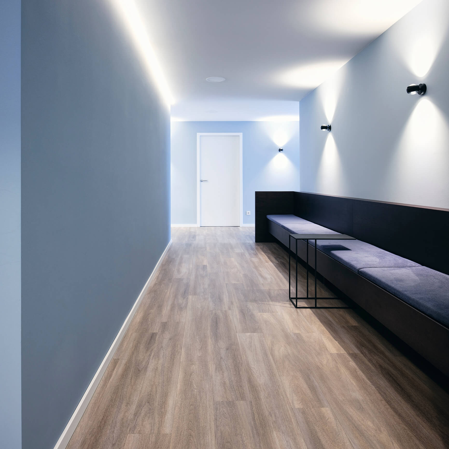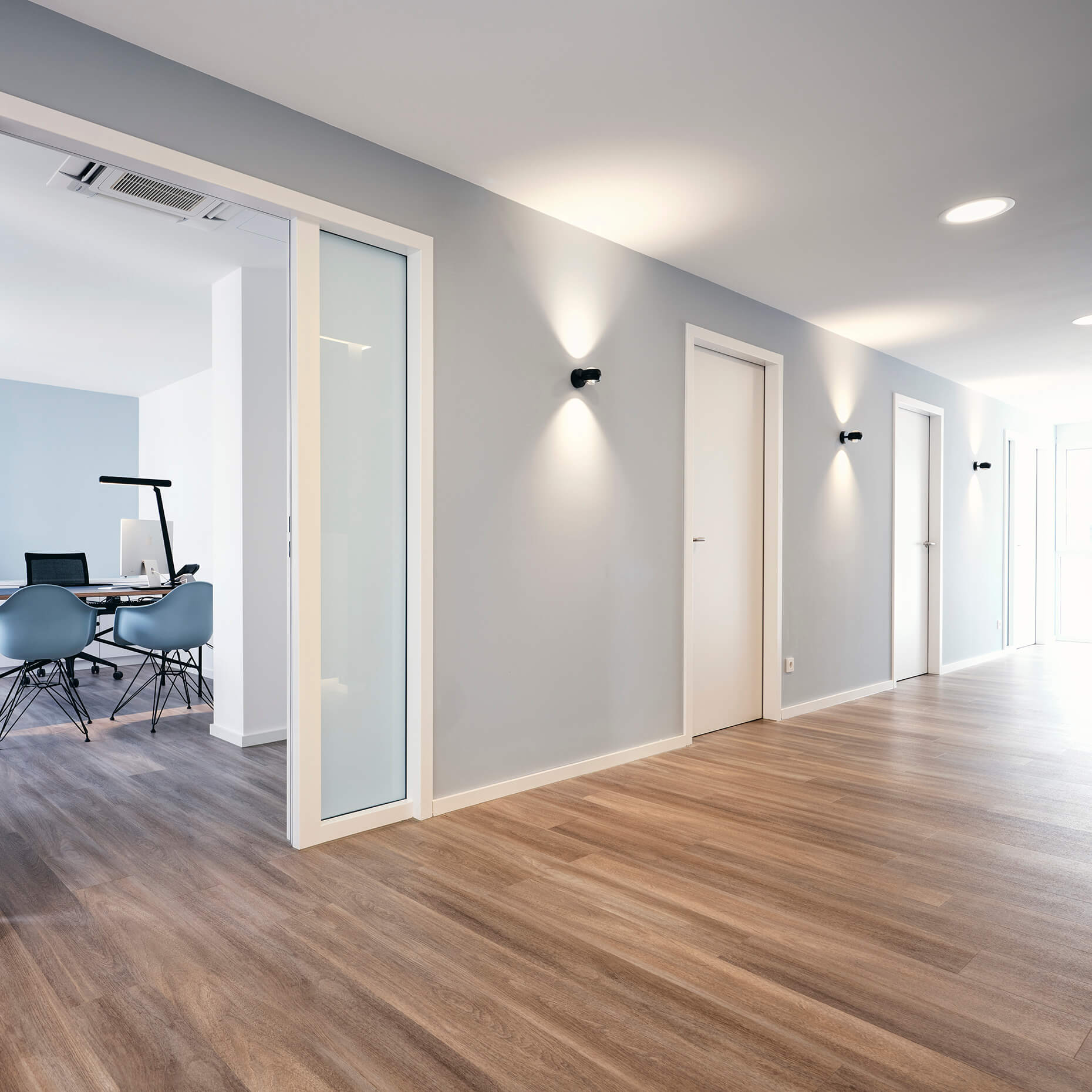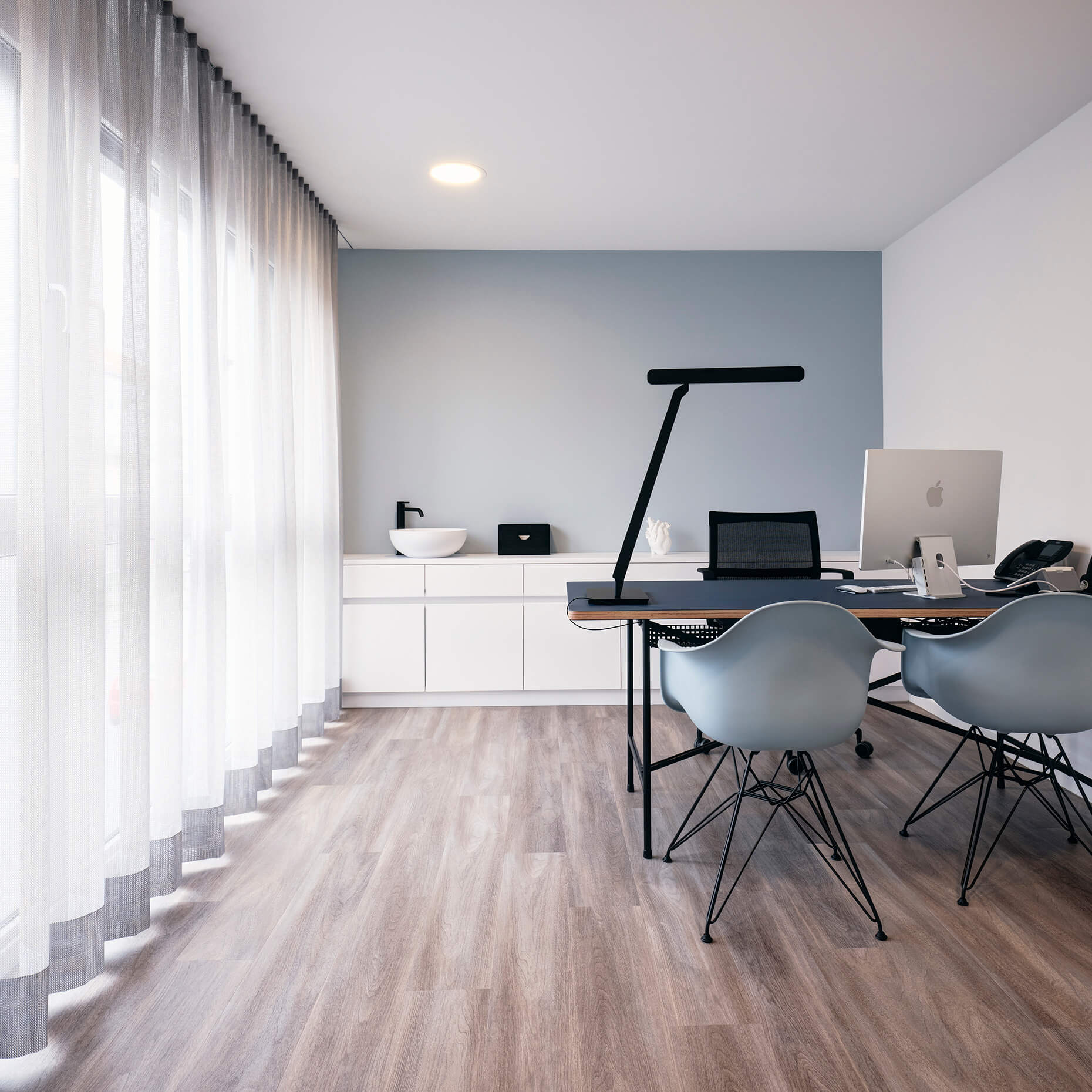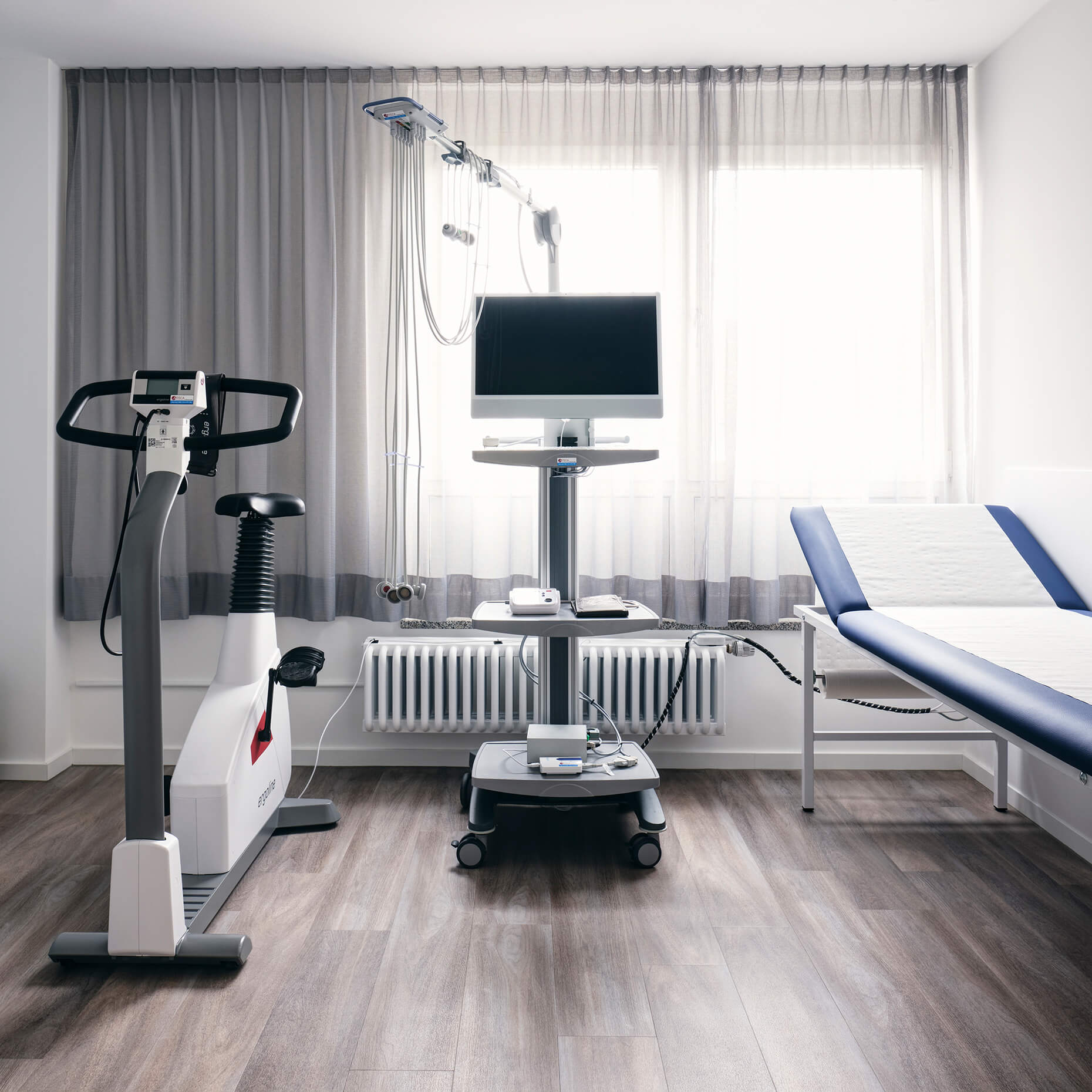 In enger Abstimmung mit dem Ärzteteam wurde zusammen mit Prof. Stefan Bannert eine kardiologische Praxis gestaltet. Die Planung berücksichtigt ergonomische Aspekte, optimiert den Workflow und fördert die Patientenbindung durch eine ansprechende Praxisästhetik.Durch sorgfältig ausgewählte Farben, eine angenehme Akustik und innovative Lichtkonzepte  entsteht eine Umgebung, die Stress reduziert und die Genesung fördert.  Die Wände sind in drei verschiedenen Blauschattierungen gehalten: der Empfangstresen, das Herz der Praxis in Dunkelblau, die Gänge in Mittelblau und die Behandlungsräume in Hellblau. Offen, transparent und leicht gestaltet sind die Besprechungsräume, sportlich gehalten die EKG-Räume. Eine Glaswand mit Vorhang sorgt für Privatsphäre am Empfang und eine angenehme Atmosphäre im Wartezimmer.