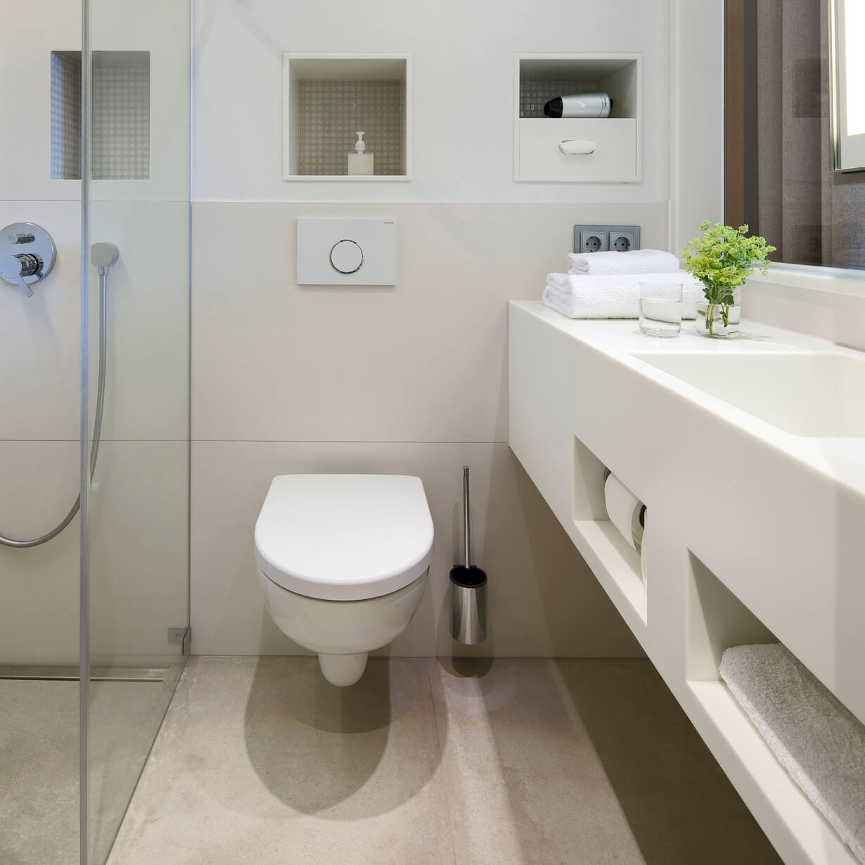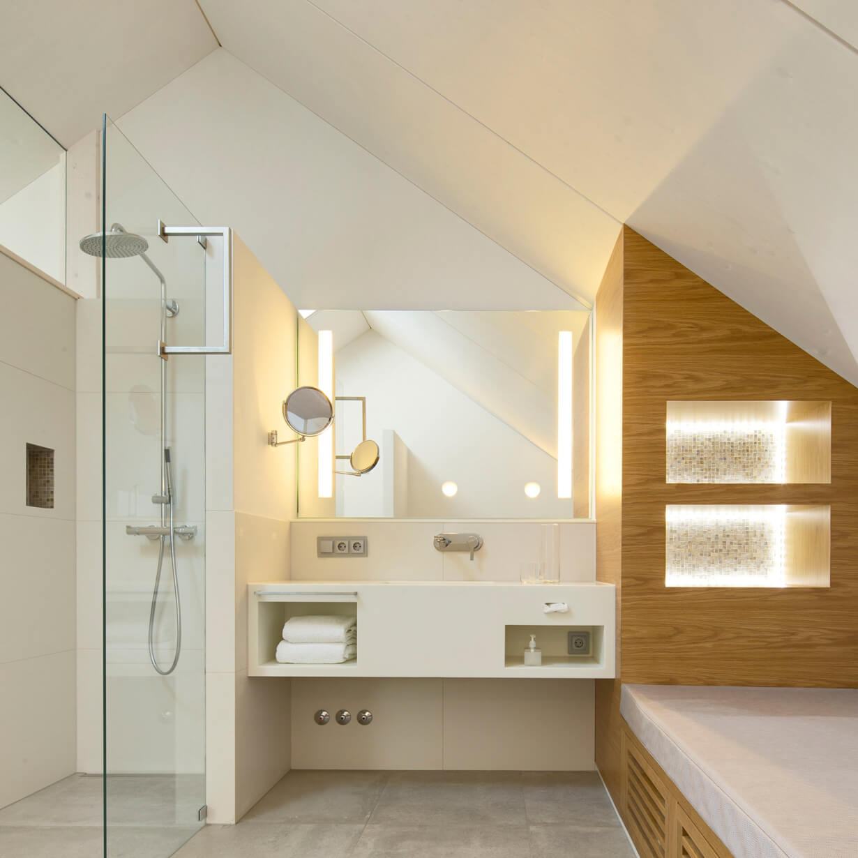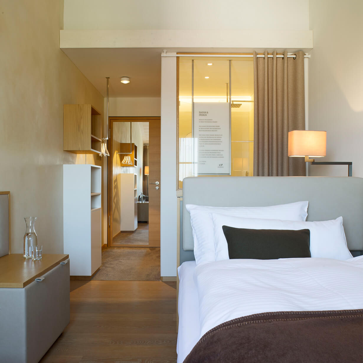 Die Bäder sind mit Glastrennwänden offen an die Zimmer angegliedert und in modernem Design gestaltet. Bodenebene Duschen und hochwertige Keramik schaffen eine ideale Ergänzung zum gemütlichen Wohn- und Schlafbereich. Die neuen Räume laden ein zum Ausspannen und Wohlfühlen.