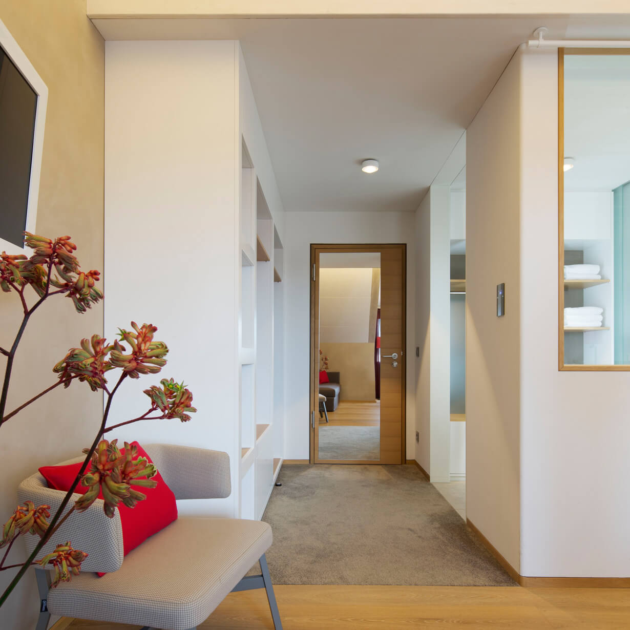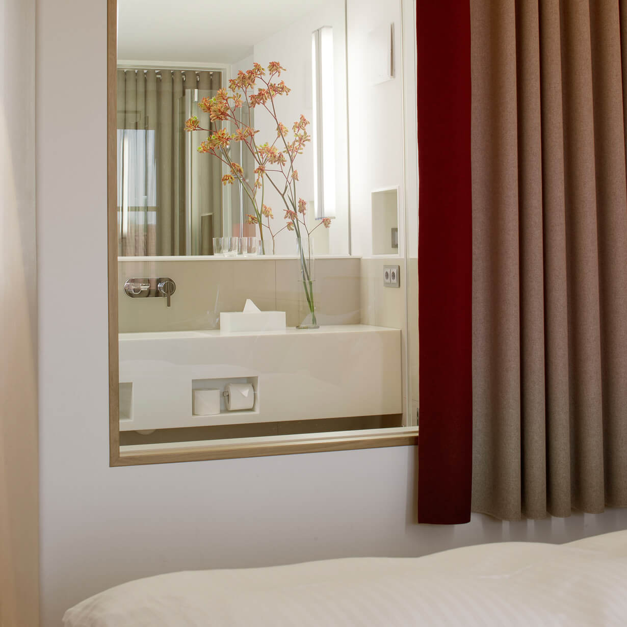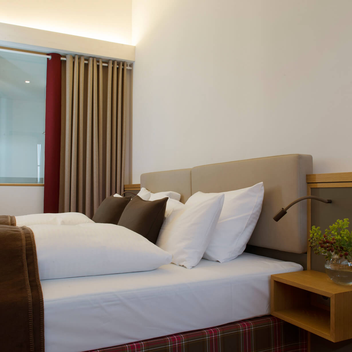 Die Bäder sind mit Glastrennwänden offen an die Zimmer angegliedert und in modernem Design gestaltet. Bodenebene Duschen und hochwertige Keramik schaffen eine ideale Ergänzung zum gemütlichen Wohn- und Schlafbereich. Die neuen Räume laden ein zum Ausspannen und Wohlfühlen.