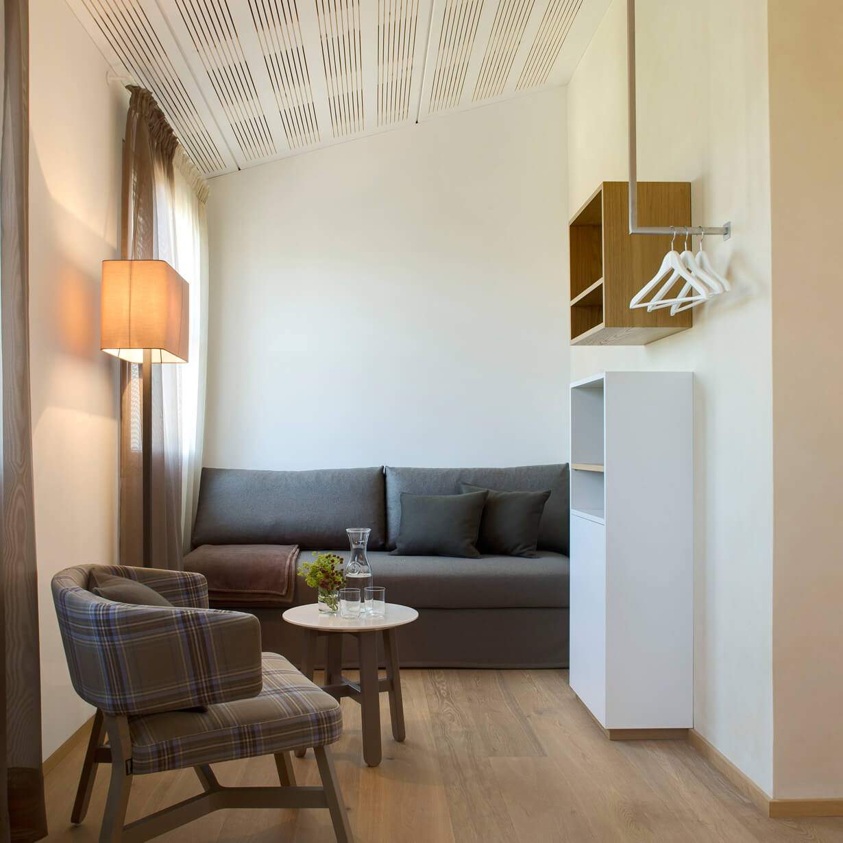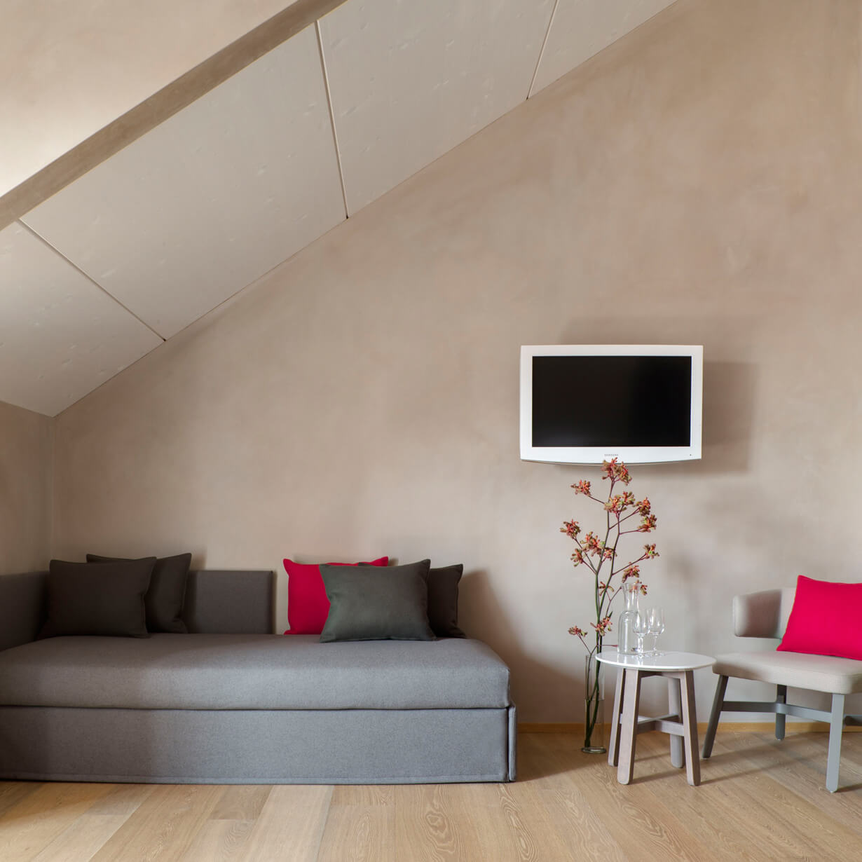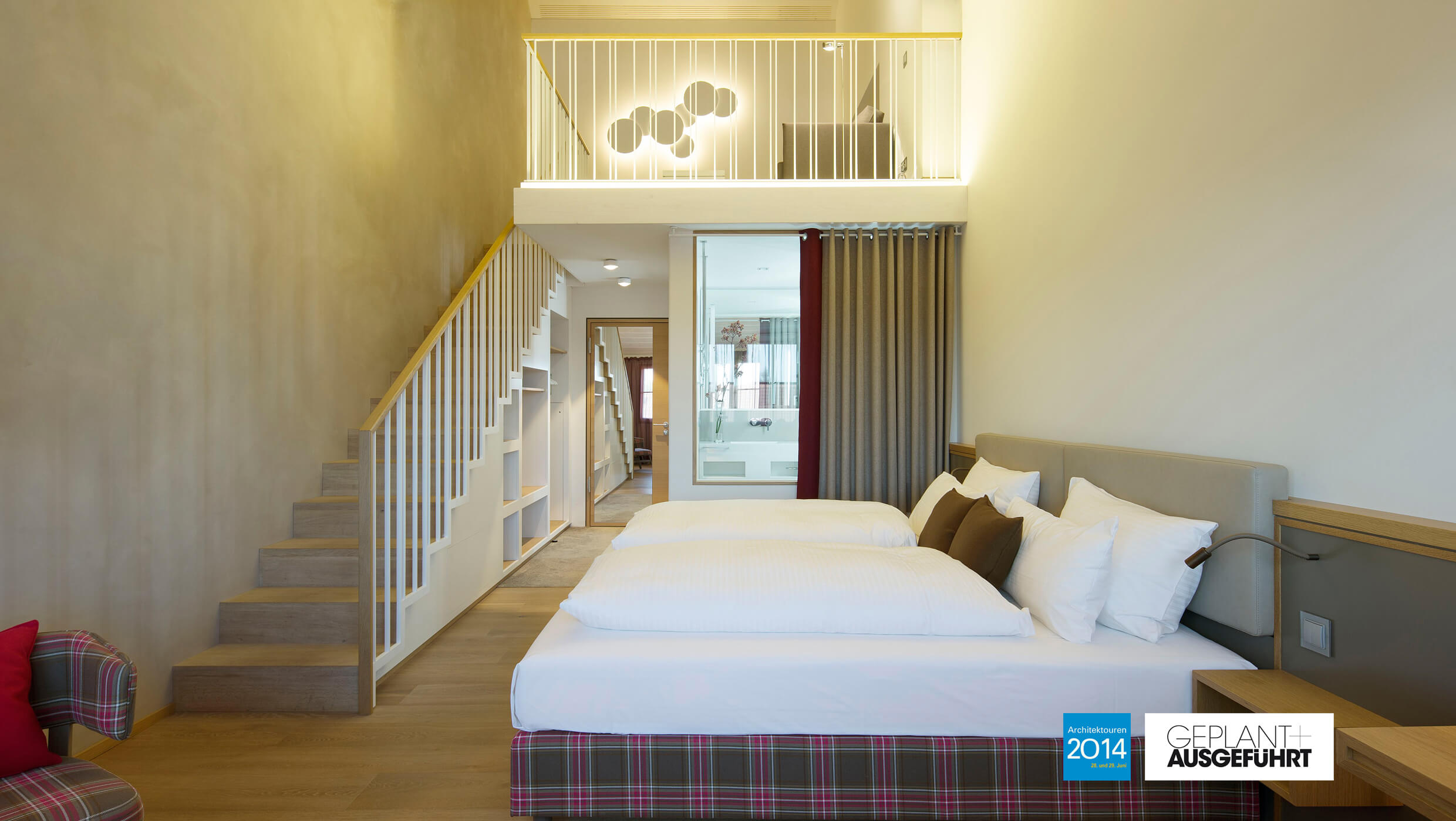 Der Ausbau der Zimmer ist geprägt durch natürliche Materialien wie geölte Holzböden und Lehmbauwände.