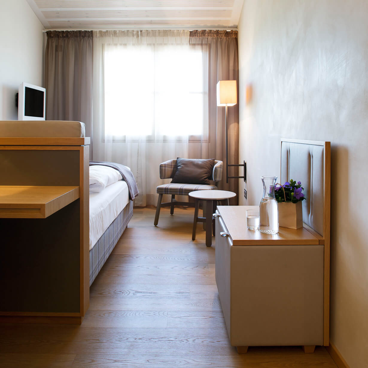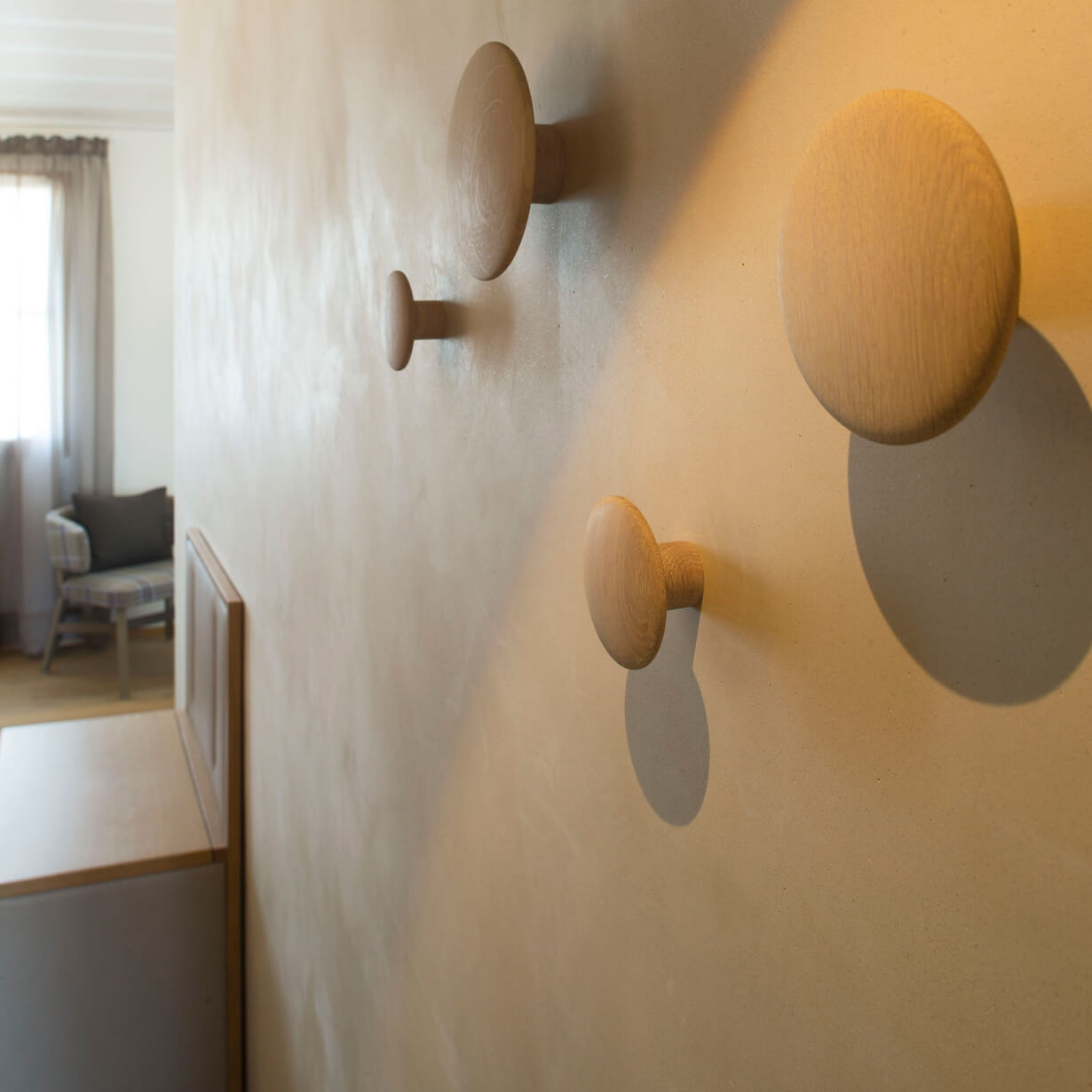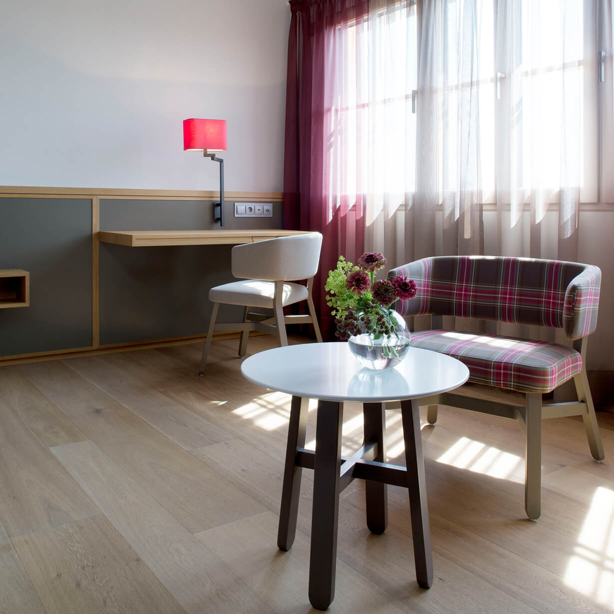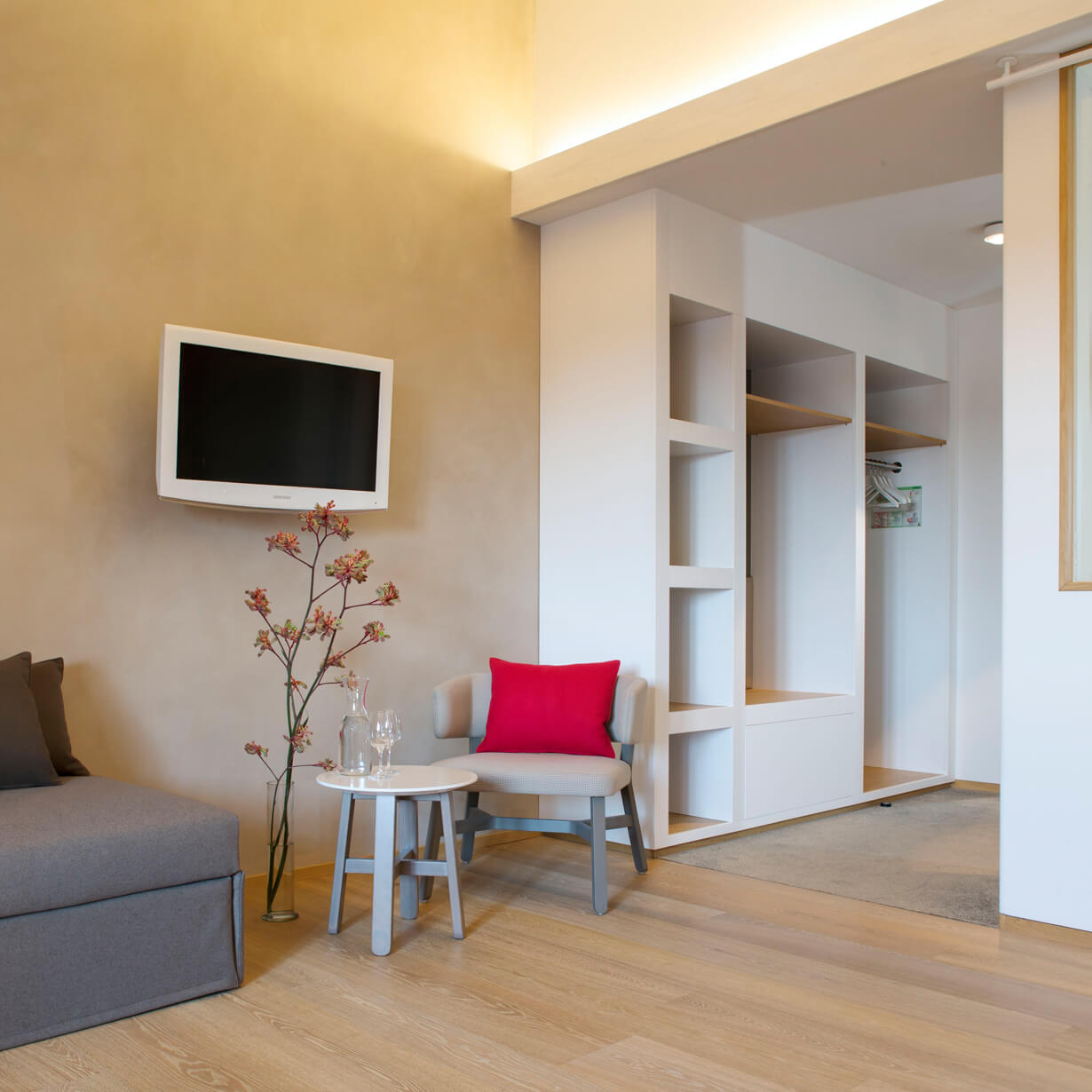 Der Ausbau der Zimmer ist geprägt durch natürliche Materialien wie geölte Holzböden und Lehmbauwände.