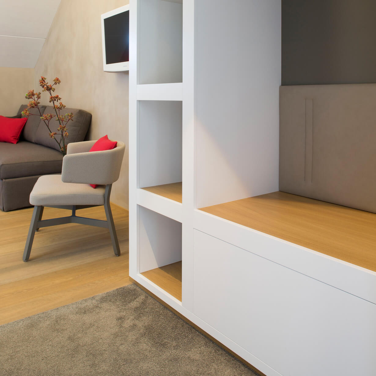 Das Dachgeschoss im Westflügel des Hotel & Gasthof zur Post in Aschheim erhielt 13 neue Gästezimmer mit darüber liegender Suite. Diese wurden in ökologischer und nachhaltiger Holzbauweise aus Massivholzelementen errichtet. Die vorgefertigten Holzwände und Dachelemente werden am Stück auf die Baustelle geliefert und montiert. Diese trockene und leichte Bauweise schont das Bestandsgebäude darunter und kann in kurzer Zeit realisiert werden. Aufgrund des schichtweisen, hochgedämmten Aufbaus der Außenwände erreicht der Neubau sehr gute Dämmwerte, die sich im Bereich des Passivhaus-Standards bewegen. Trotz der Gebäudeklasse 5 / Sonderbau konnte das Projekt in Holz realisiert werden, da im Vorfeld die Planung, das Brandschutzkonzept und die Statik mit den Behörden abgestimmt wurden.