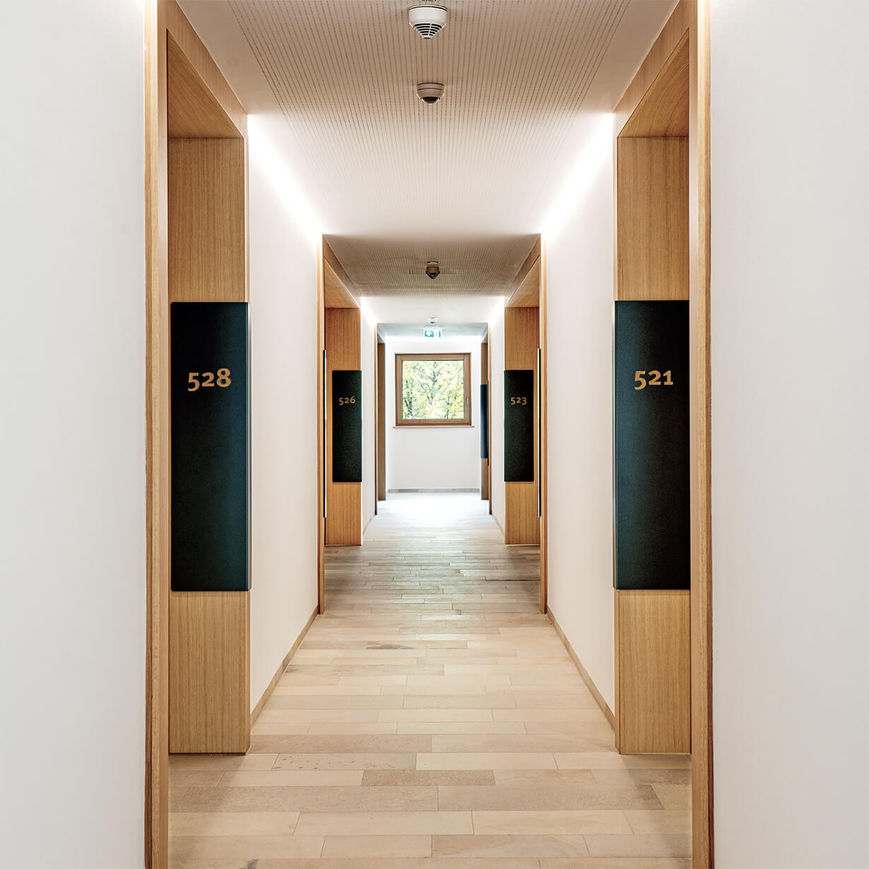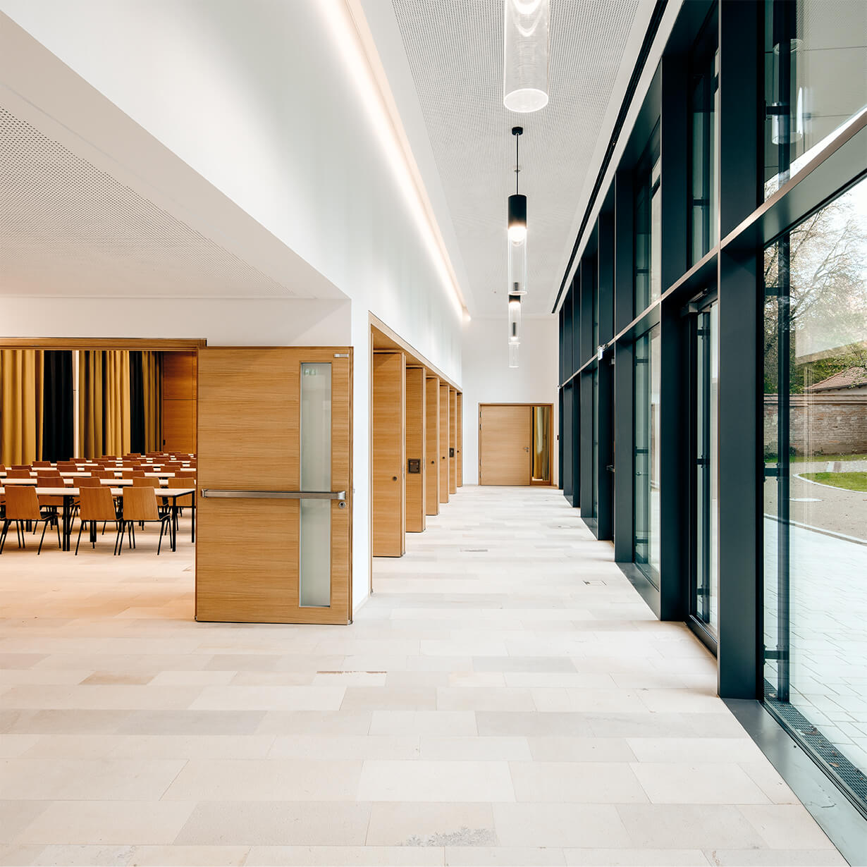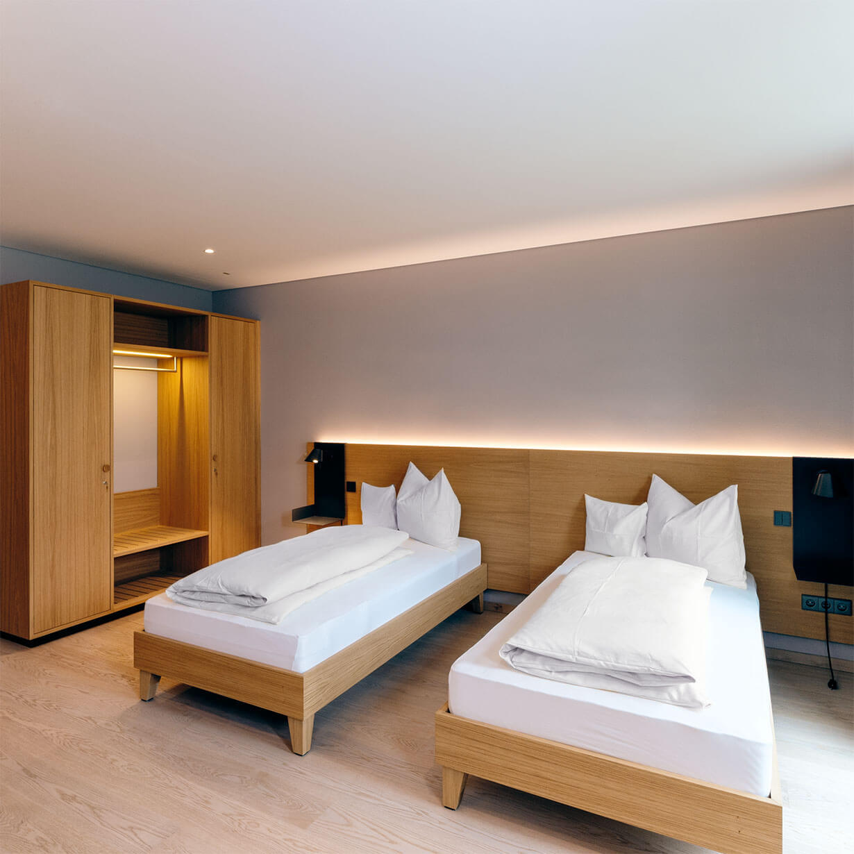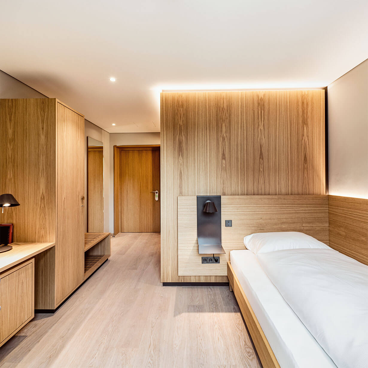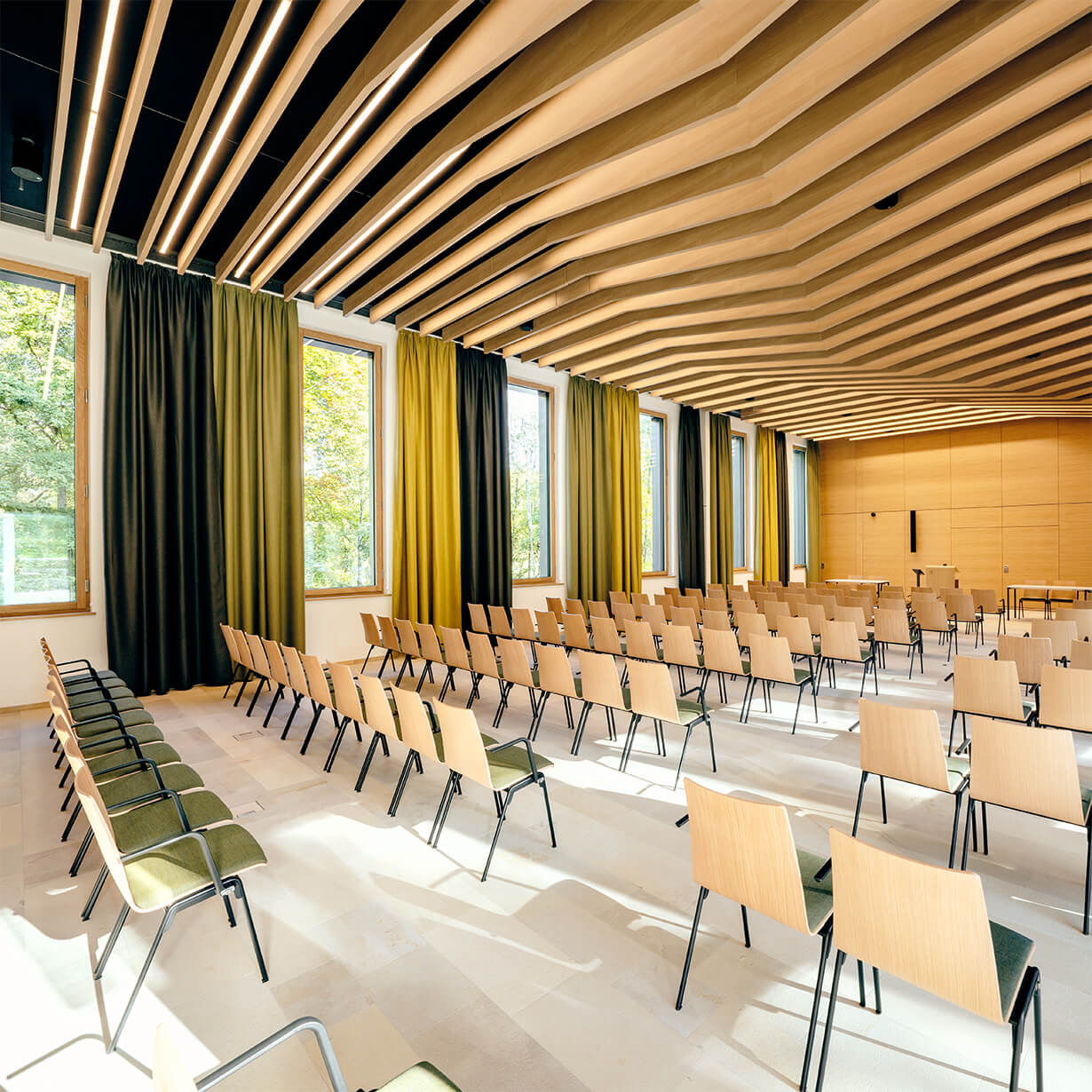 Der Gartensaal der Küferei liegt am östlichen Rand des Geländes und schließt mit seiner öffnenden Geste die Parklandschaft ab. Er wirkt wie eine Bühne eines natürlichen Amphitheaters. Dies erklärt auch die Widmung der Farb- und Materialgebung für den Saal. Zum Bodenbelag der hellbeigen Solnhofer Natursteinplatten und den in Eiche Natur gehaltenen Trennwänden kann die Fensterfront mit raumhohen Dimout-Vorhängen in drei aufeinander abgestimmten Grüntönen verdunkelt werden. Die maximal flexible Konferenzmöbelierung erlaubt ein schnelles und unkompliziertes Bestuhlen für Vorträge, Konzerte und Konferenzen. Das Schwäbische Bildungszentrum erhält 19 neue Gästezimmer auf topaktuellem Hotelniveau in der Vier-Sterne-Kategorie, jedoch gestalterisch reduziert auf die Haltung eines klösterlichen Herbergsgedanken. Die „Entbehrungen“ betreffen in keiner Weise den Komfort der neuen Räume, jedoch nehmen sich die Zimmer im Bezug auf Gestaltungs- und Designvielfalt zurück. Die acht Doppel-, sieben Einzel- und vier barrierefreien Zimmer leben von der Klarheit der Formensprache und der Verwendung weniger, aber natürlichen Materialien. Die klare Linienführung bei der Gestaltung der Schreinermöbel wird durch indirekte Beleuchtungselemente in den Möbeln unterstrichen. Die fein nuancierten, abgetönten Wandfarben und die raumhohen textilen Vorhänge reagieren auf die beiden unterschiedlichen Etagen und den leicht veränderten Lichteinfall.