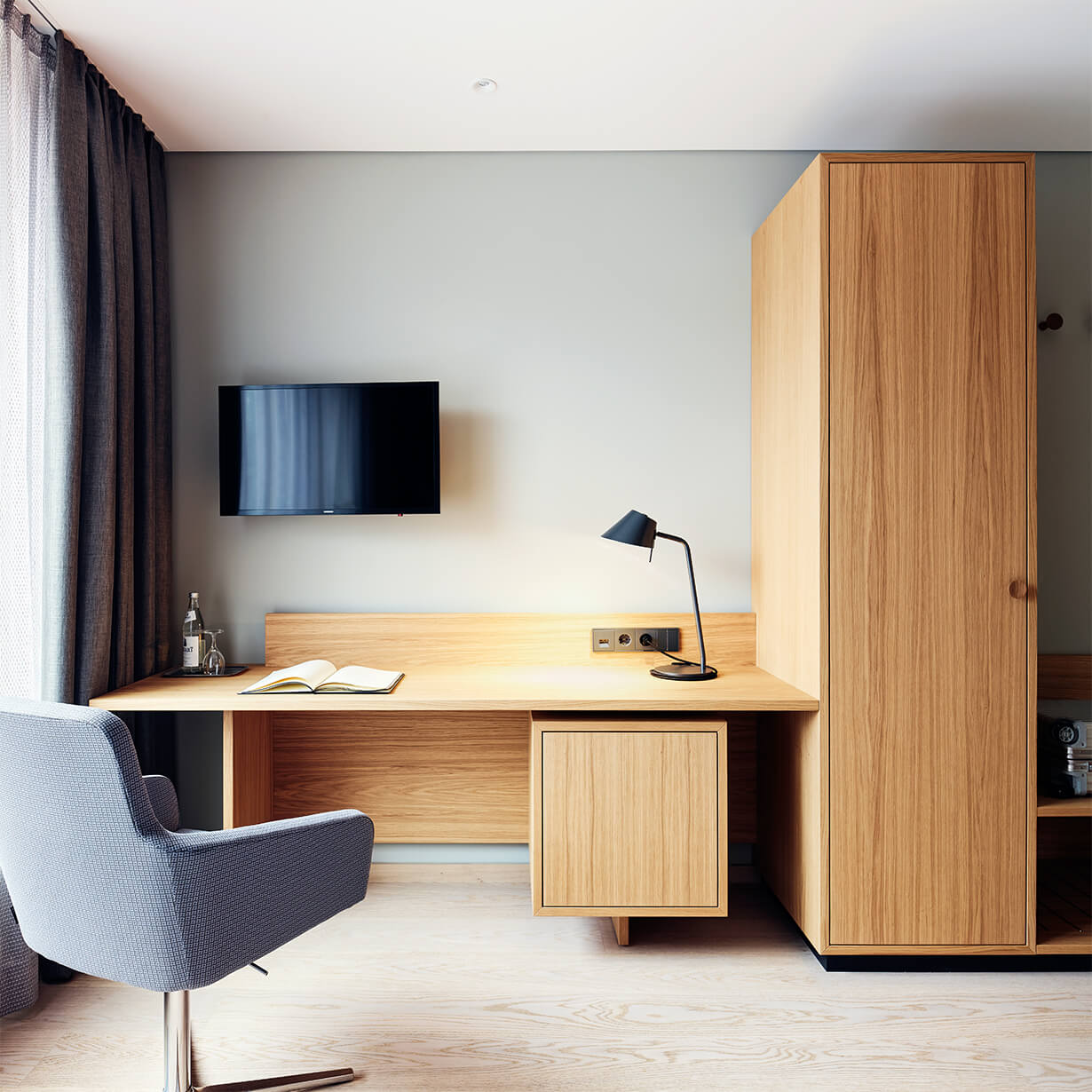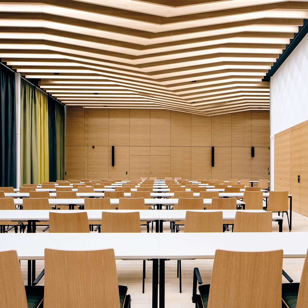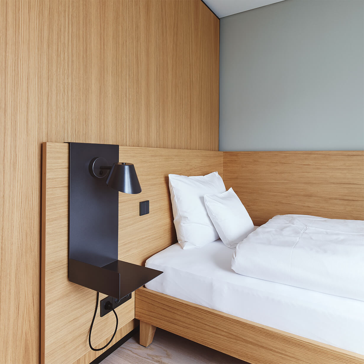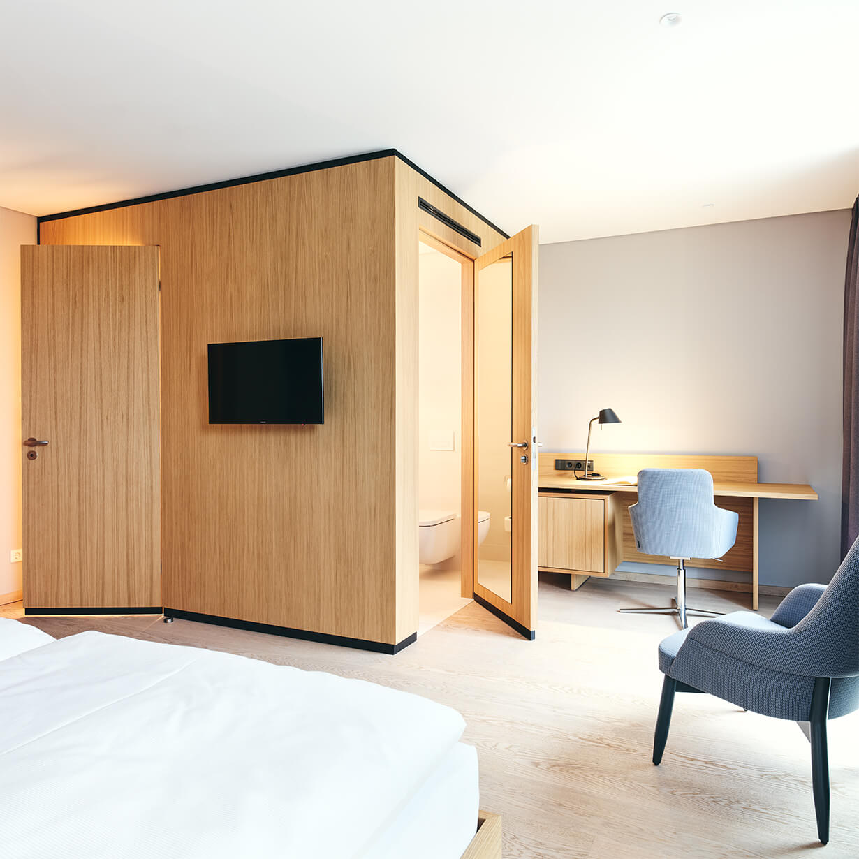 Der Gartensaal der Küferei liegt am östlichen Rand des Geländes und schließt mit seiner öffnenden Geste die Parklandschaft ab. Er wirkt wie eine Bühne eines natürlichen Amphitheaters. Dies erklärt auch die Widmung der Farb- und Materialgebung für den Saal. Zum Bodenbelag der hellbeigen Solnhofer Natursteinplatten und den in Eiche Natur gehaltenen Trennwänden kann die Fensterfront mit raumhohen Dimout-Vorhängen in drei aufeinander abgestimmten Grüntönen verdunkelt werden. Die maximal flexible Konferenzmöbelierung erlaubt ein schnelles und unkompliziertes Bestuhlen für Vorträge, Konzerte und Konferenzen. Das Schwäbische Bildungszentrum erhält 19 neue Gästezimmer auf topaktuellem Hotelniveau in der Vier-Sterne-Kategorie, jedoch gestalterisch reduziert auf die Haltung eines klösterlichen Herbergsgedanken. Die „Entbehrungen“ betreffen in keiner Weise den Komfort der neuen Räume, jedoch nehmen sich die Zimmer im Bezug auf Gestaltungs- und Designvielfalt zurück. Die acht Doppel-, sieben Einzel- und vier barrierefreien Zimmer leben von der Klarheit der Formensprache und der Verwendung weniger, aber natürlichen Materialien. Die klare Linienführung bei der Gestaltung der Schreinermöbel wird durch indirekte Beleuchtungselemente in den Möbeln unterstrichen. Die fein nuancierten, abgetönten Wandfarben und die raumhohen textilen Vorhänge reagieren auf die beiden unterschiedlichen Etagen und den leicht veränderten Lichteinfall.