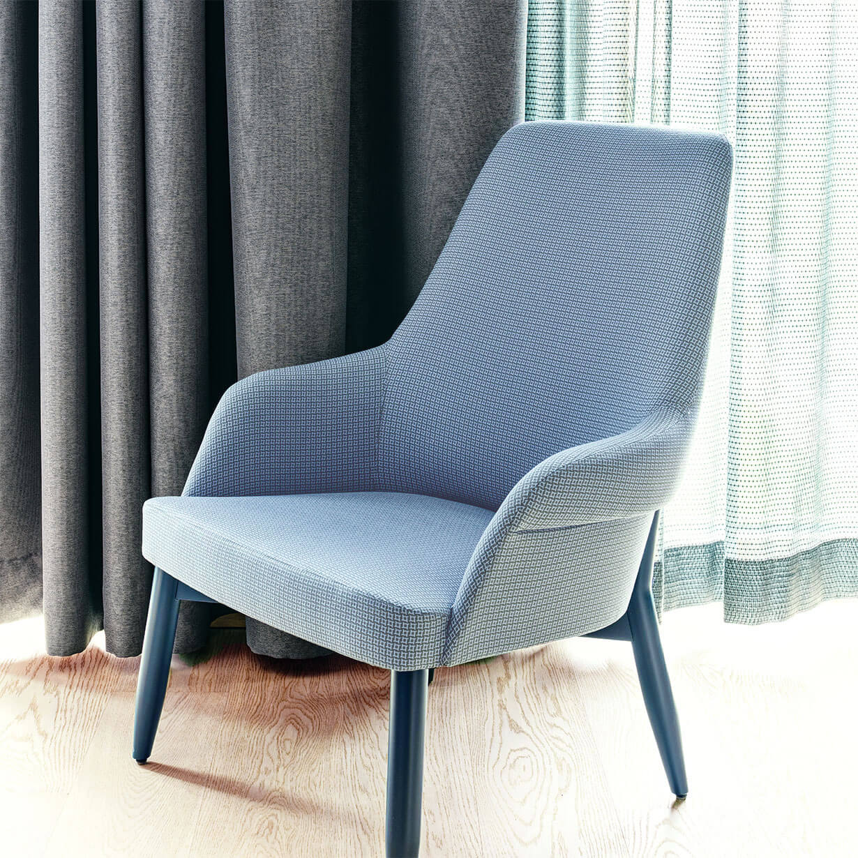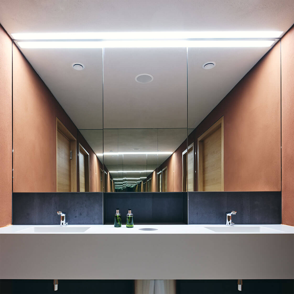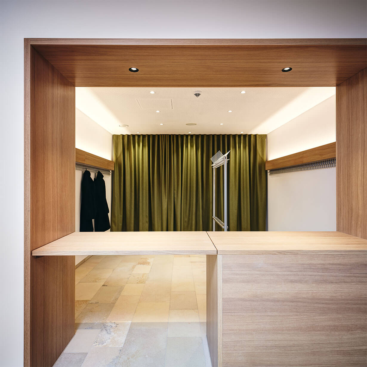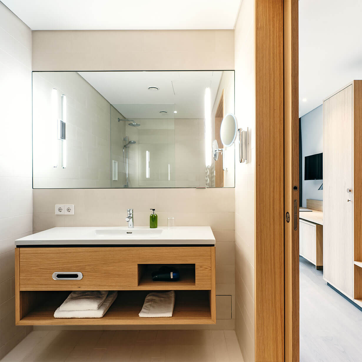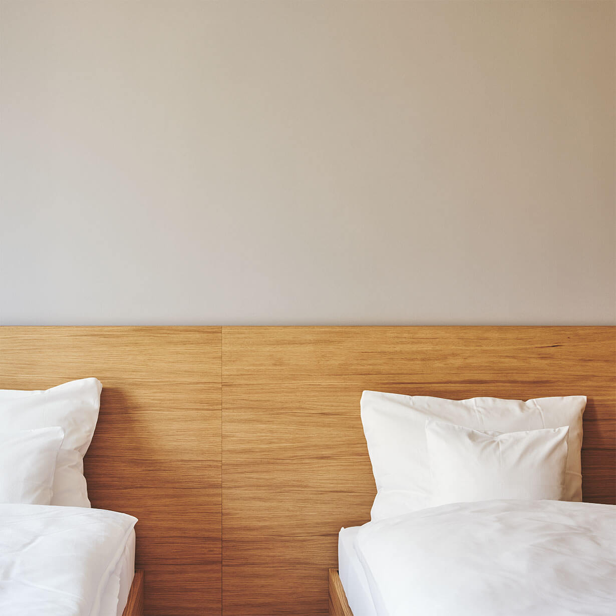 Der Gartensaal der Küferei liegt am östlichen Rand des Geländes und schließt mit seiner öffnenden Geste die Parklandschaft ab. Er wirkt wie eine Bühne eines natürlichen Amphitheaters. Dies erklärt auch die Widmung der Farb- und Materialgebung für den Saal. Zum Bodenbelag der hellbeigen Solnhofer Natursteinplatten und den in Eiche Natur gehaltenen Trennwänden kann die Fensterfront mit raumhohen Dimout-Vorhängen in drei aufeinander abgestimmten Grüntönen verdunkelt werden. Die maximal flexible Konferenzmöbelierung erlaubt ein schnelles und unkompliziertes Bestuhlen für Vorträge, Konzerte und Konferenzen. Das Schwäbische Bildungszentrum erhält 19 neue Gästezimmer auf topaktuellem Hotelniveau in der Vier-Sterne-Kategorie, jedoch gestalterisch reduziert auf die Haltung eines klösterlichen Herbergsgedanken. Die „Entbehrungen“ betreffen in keiner Weise den Komfort der neuen Räume, jedoch nehmen sich die Zimmer im Bezug auf Gestaltungs- und Designvielfalt zurück. Die acht Doppel-, sieben Einzel- und vier barrierefreien Zimmer leben von der Klarheit der Formensprache und der Verwendung weniger, aber natürlichen Materialien. Die klare Linienführung bei der Gestaltung der Schreinermöbel wird durch indirekte Beleuchtungselemente in den Möbeln unterstrichen. Die fein nuancierten, abgetönten Wandfarben und die raumhohen textilen Vorhänge reagieren auf die beiden unterschiedlichen Etagen und den leicht veränderten Lichteinfall.
