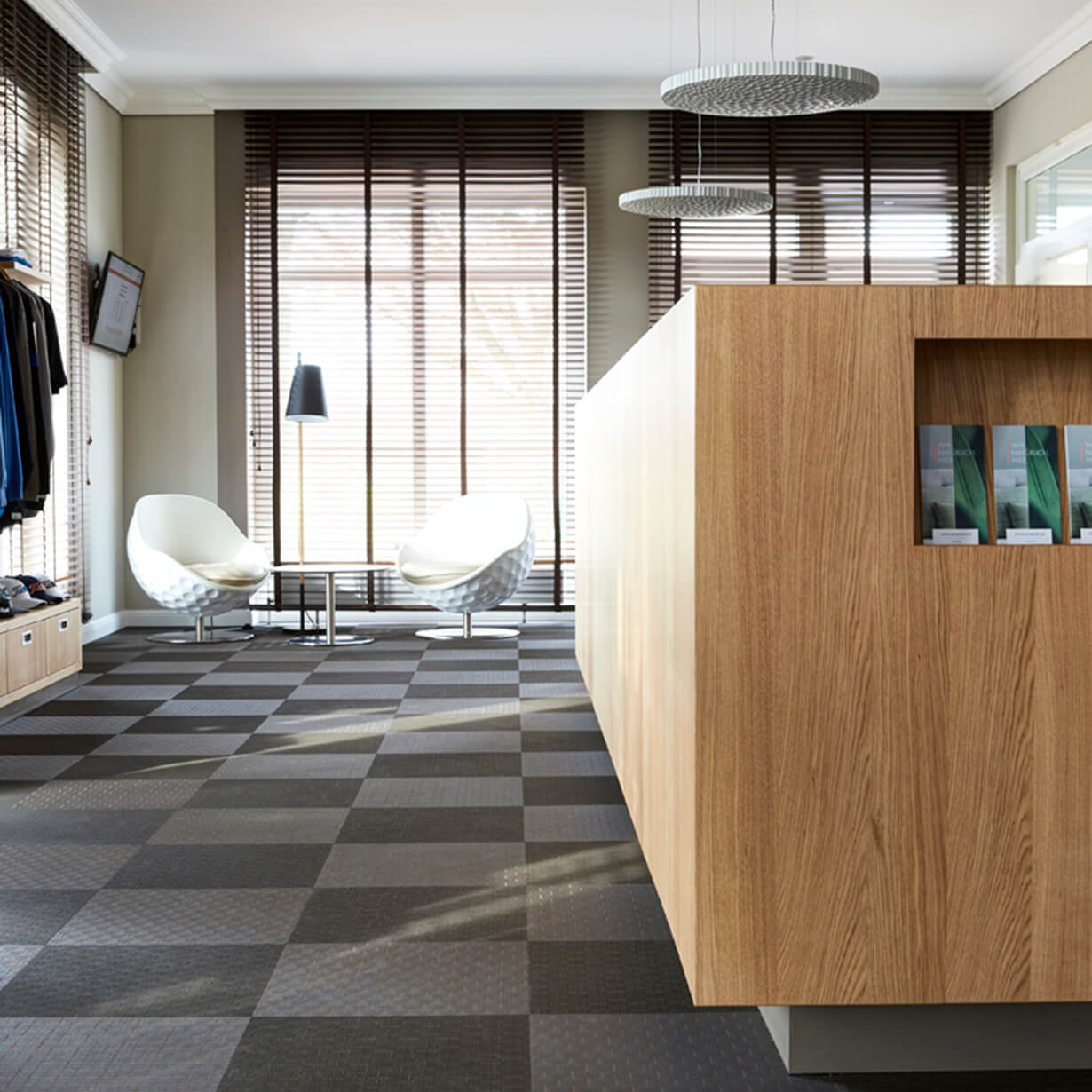 Die neue Anlaufstelle für alle Golfer ist ein Alleskönner: Warten, Informieren, Buchen, Reservieren, Shoppen und Verwalten wird hier kompakt abgewickelt. Als Material wird Eiche verbaut, strapazierfähig und klassisch zugleich. Graubraun- und Sandtöne ergänzen die Theke und die Shopmöbel, damit die Produkte in den Focus rücken. Ab und zu blitz noch weiß auf – weiß wie der Golfball oder das Icon-Möbel, das als Blickfänger am Eingang wartet.