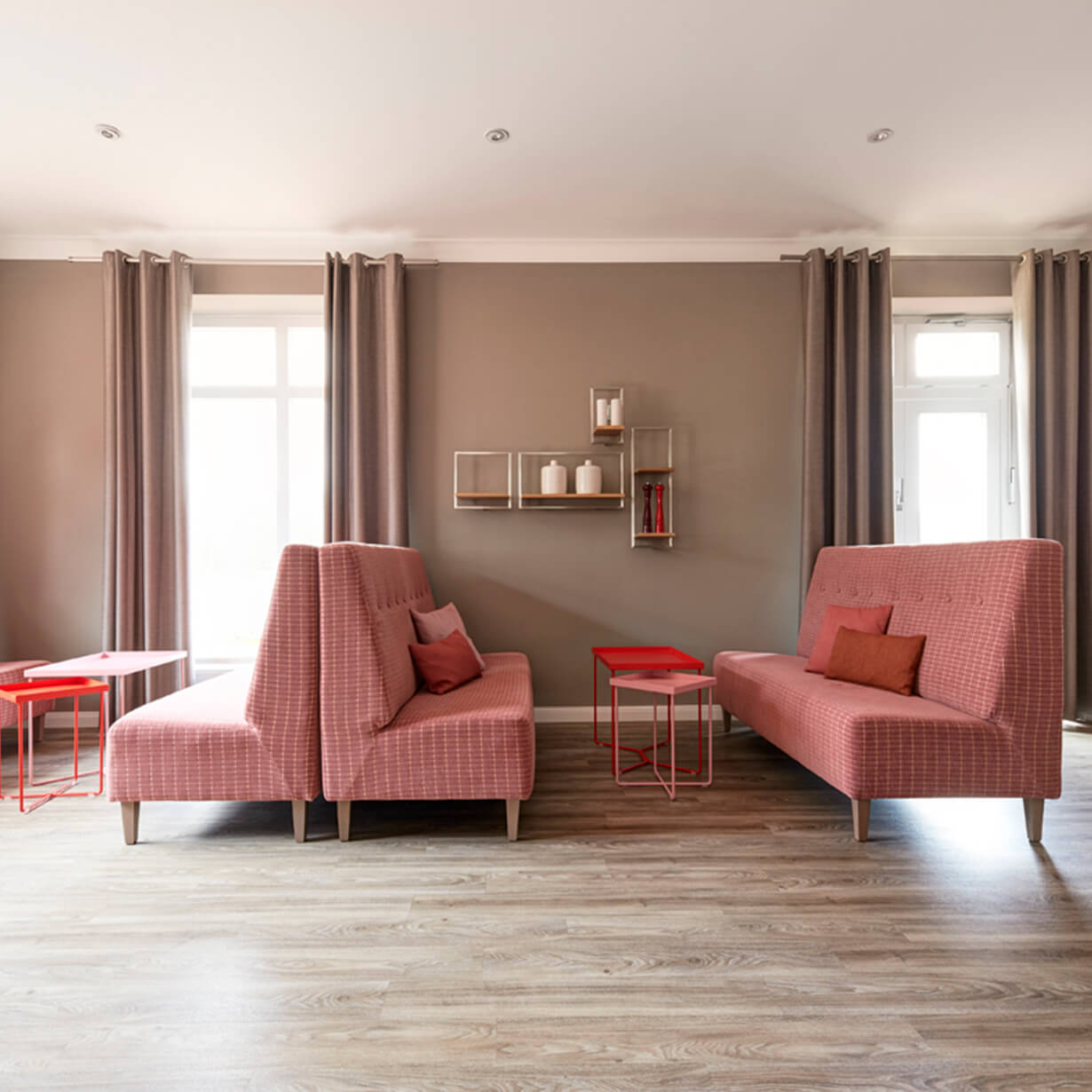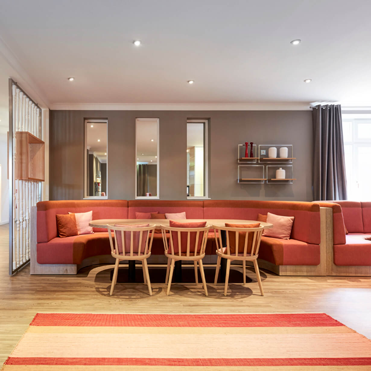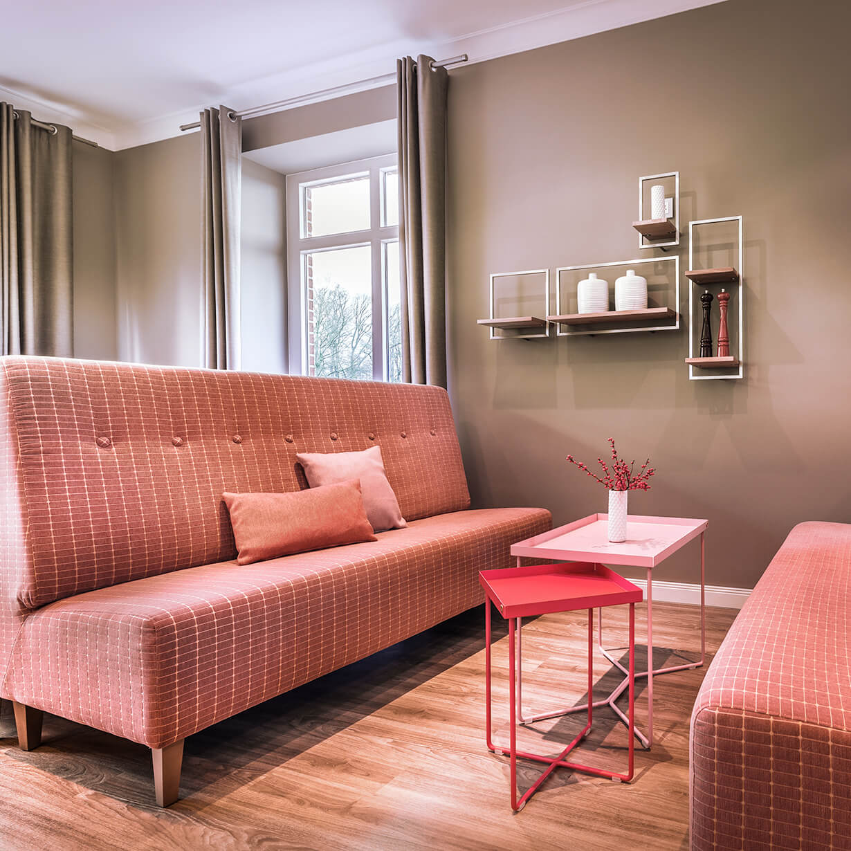 Die sanfte Überarbeitung des Golfrestaurants und des dazugehörigen Bistros setzt auf elegante Grautöne für Wand und Vorhänge und lockert dies mit Farbtupfern in rot, rost und rose auf. An zwei großen Familientischen mit gemütlichen Eckbänken können sich große Gruppen verabreden. Die Damen erhalten bequeme Polsterbänke und Couchtischchen für einen gepflegten Tee mit Ausblick in den Park.