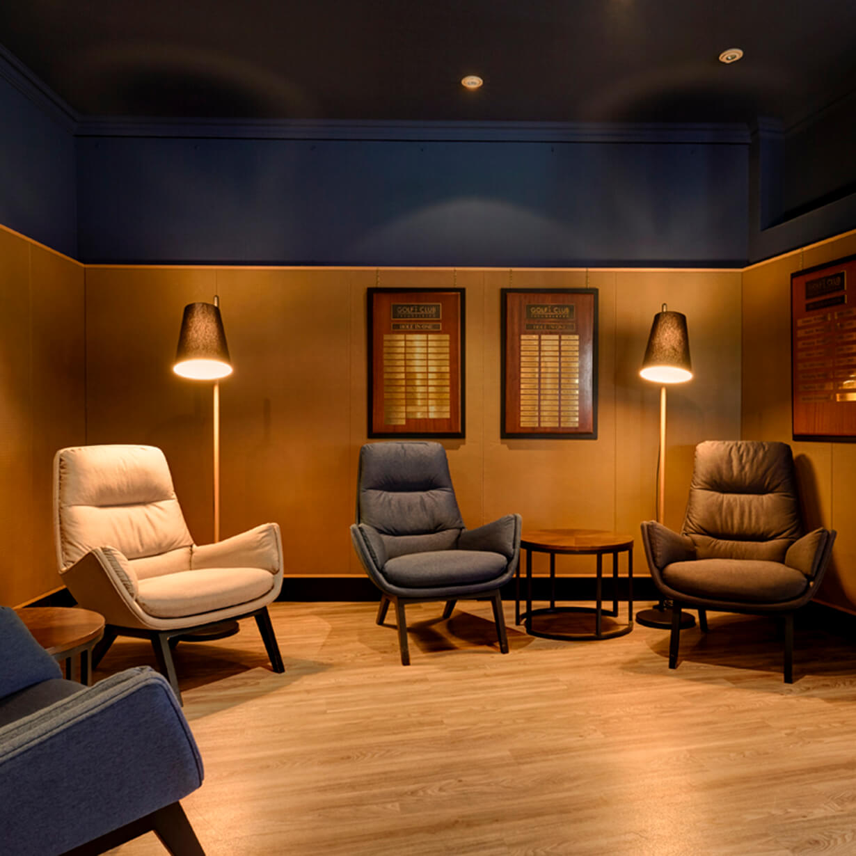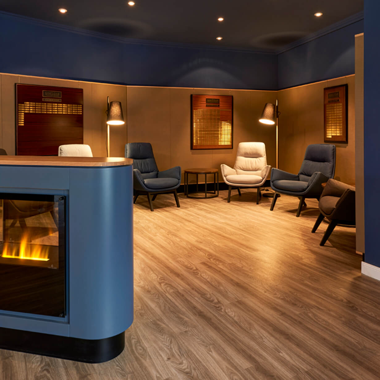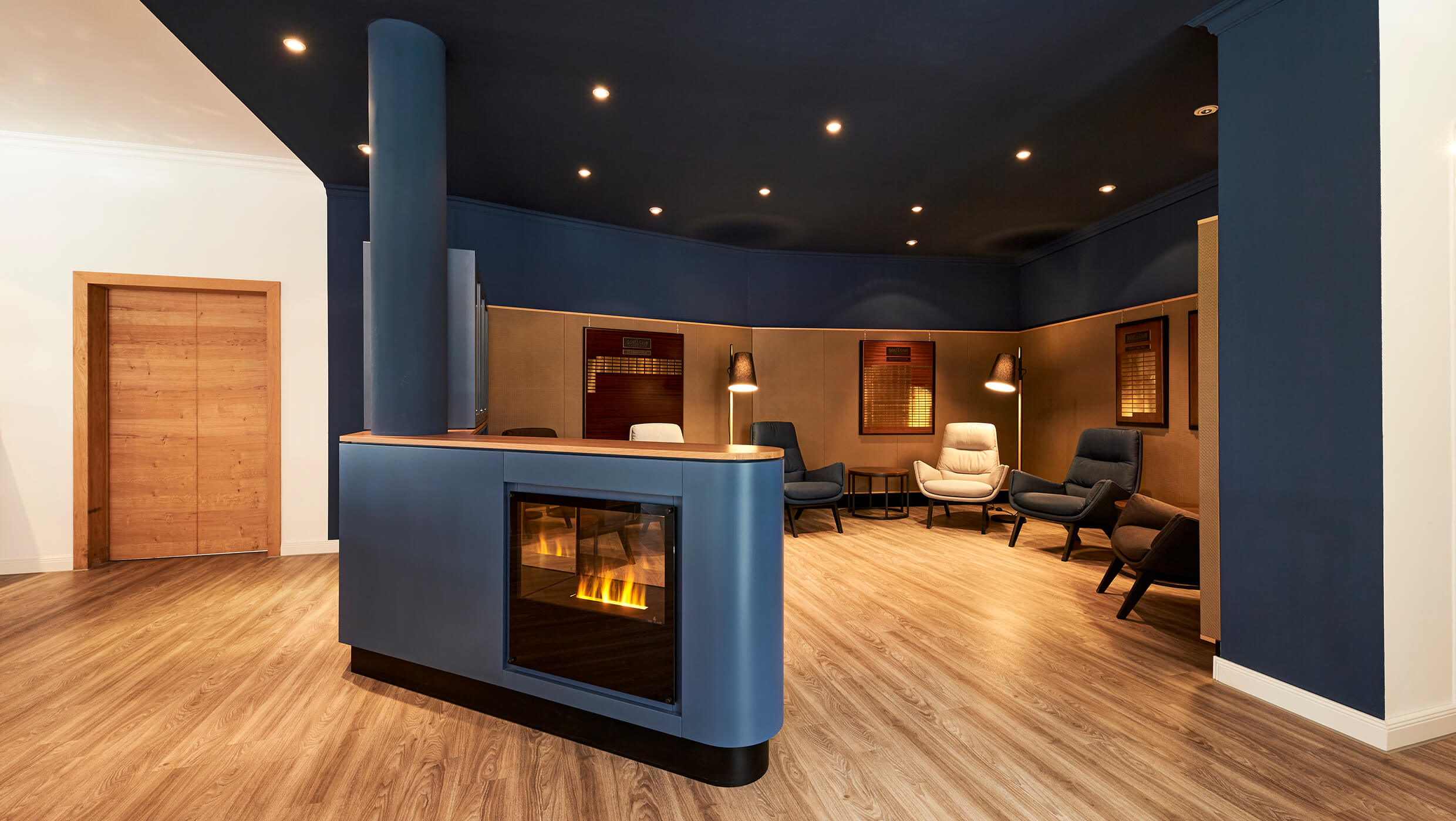 Den Herren der Golfschöpfung ist eine adäquate Lounge gewidmet. Im dunkelblauen Salon zwischen den Trophy-Tafeln und Pokalen der prämierten Turniersieger warten einladende Sessel und Stehleuchten auf einen Drink oder eine Fachlektüre am Gaskamin. Wandverkleidungen aus geprägtem Leder runden die Herrenlounge ab, in der selbstverständlich auch Damen der Golfschöpfung willkommen sind.