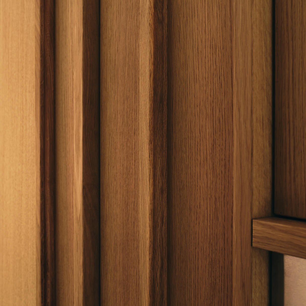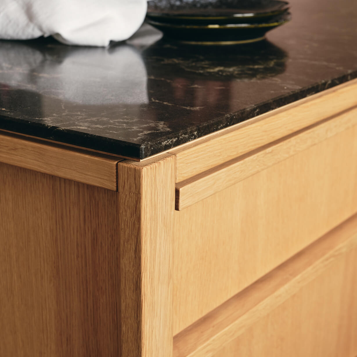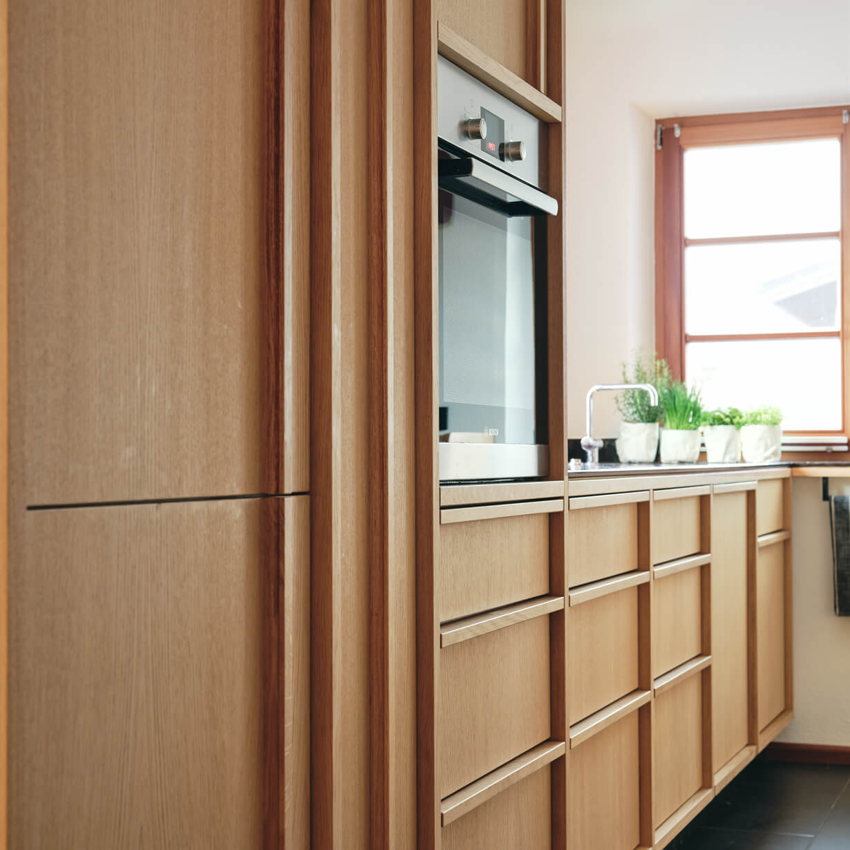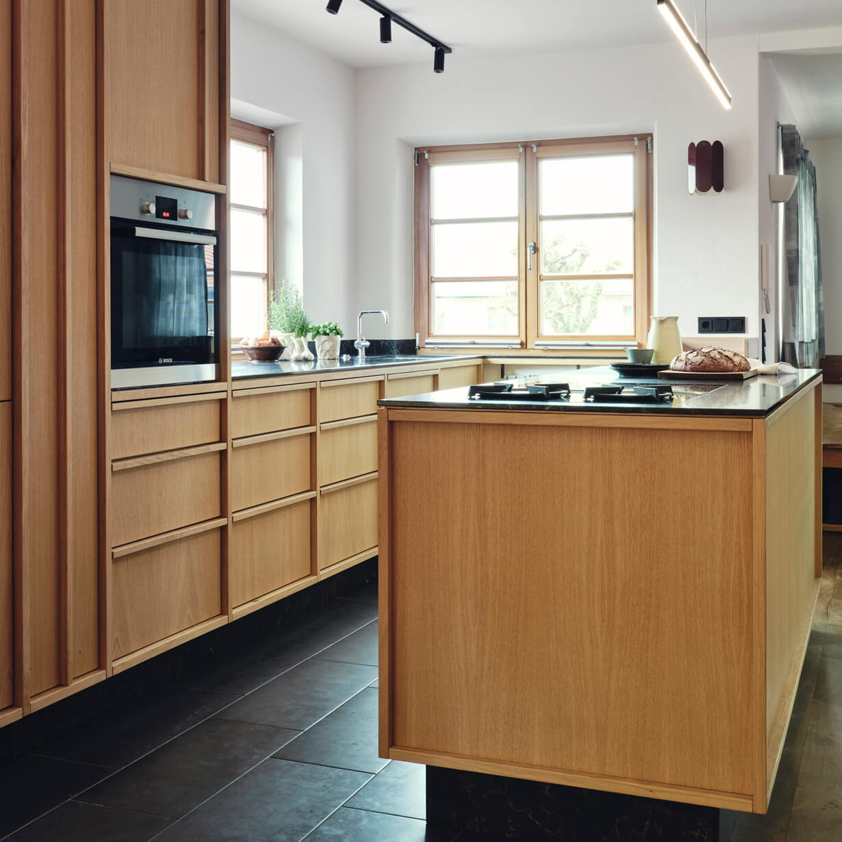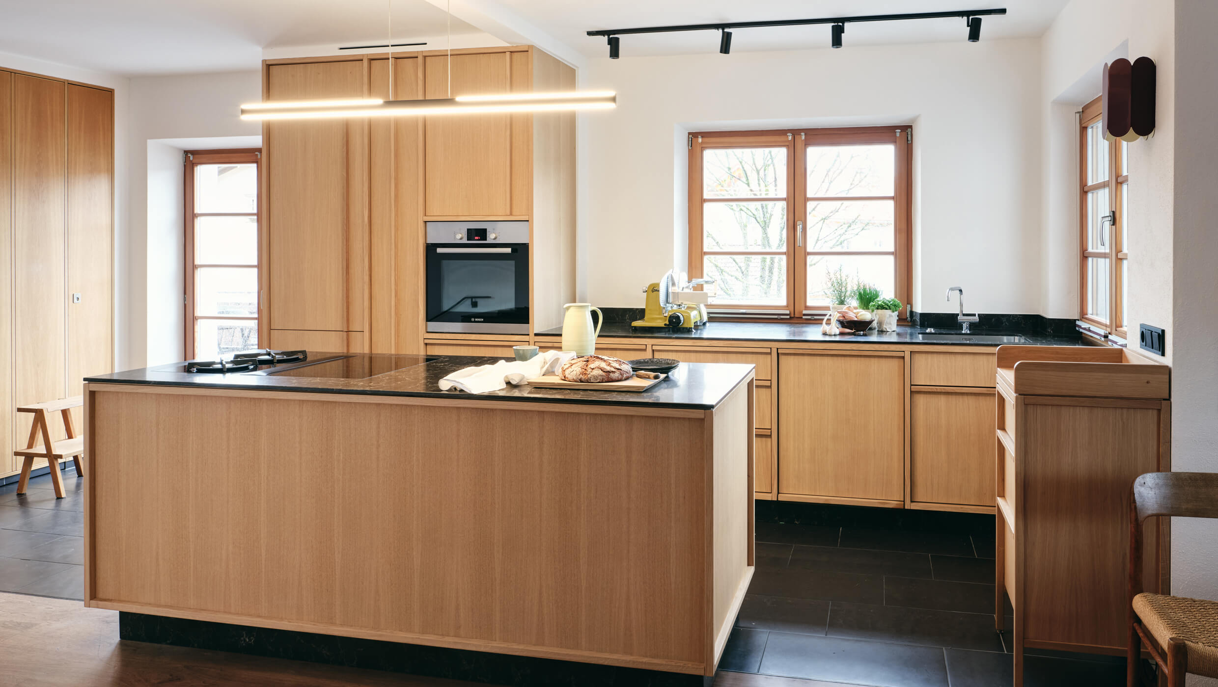 Entscheidend ist die richtige Platzierung der Funktionen im Raum. Die Dame – und der Herr – des Hauses hat von der Küche aus Blickkontakt zum Essbereich, während es rundherum plaudert und blubbert. Der Kochblock bildet die neue Mitte der gesamten Fläche und wird auch wie ein Wohnmöbel genutzt. Fensterseitig liegen Arbeitsflächen und Waschbecken, die vom Tageslicht profitieren. Die Nähe zum bestehenden Esszimmer und zu den Holzeinbauten, sowie die Holzböden und Fenster bestimmten die Oberfläche der hellen, naturfarbenen Eiche. Gestalterisch dockt die Küche damit an die Gemütlichkeit außenherum an. Auch die Arbeitsplatte aus schwarzem Mineralwerkstein korrespondiert mit dem Schieferboden des Bestandes und verbindet somit alt und neu vortrefflich. Die glatten, straighten Oberflächen erhalten durch die gezeigte Rahmenkonstruktion und die horizontalen und vertikalen Griffleisten eine Leichtigkeit, die das Volumen der Schränke optisch reduziert. Zudem lässt der schwarzen Sockel die Küche optisch im Raum schweben.